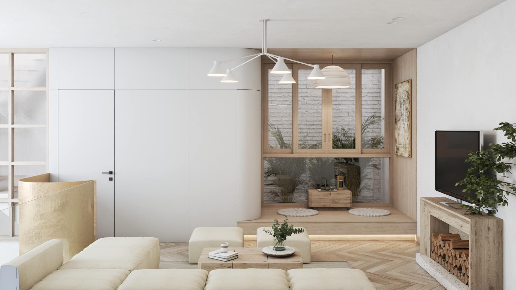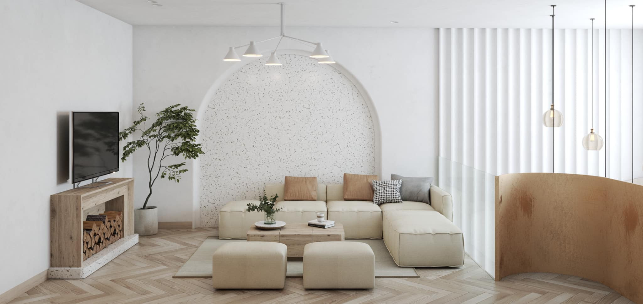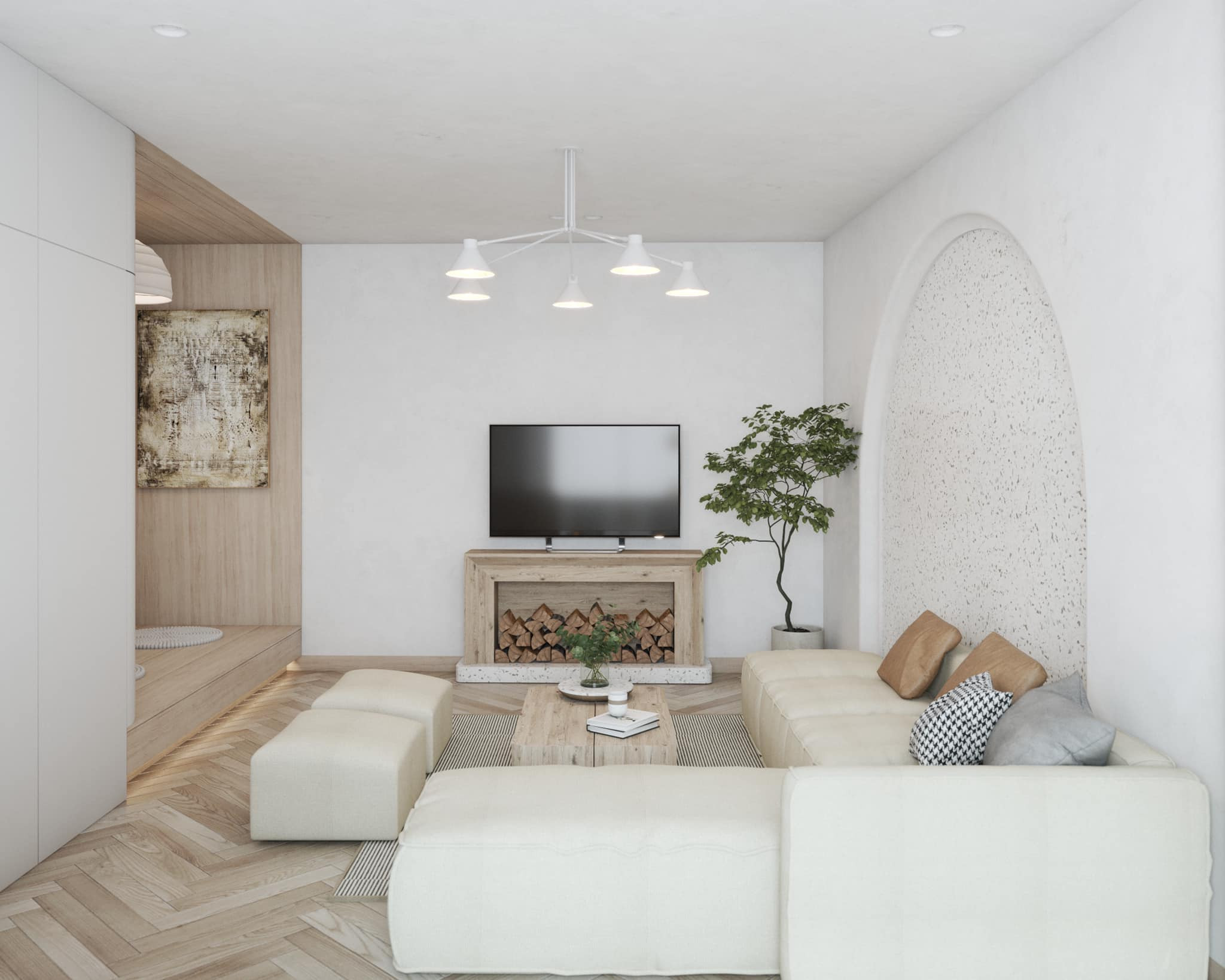 Mặc dù diện tích hạn hẹp nhưng nhà ngập tràn ánh sáng, sang trọng và hiện đại. Dự kiến công trình sẽ khởi công cuối năm 2022 với kinh phí trên 3 tỷ đồng. Phòng khách sử dụng ngôn ngữ hiện đại, tối giản. Kệ tivi mang dáng dấp chiếc lò sưởi ấm áp.