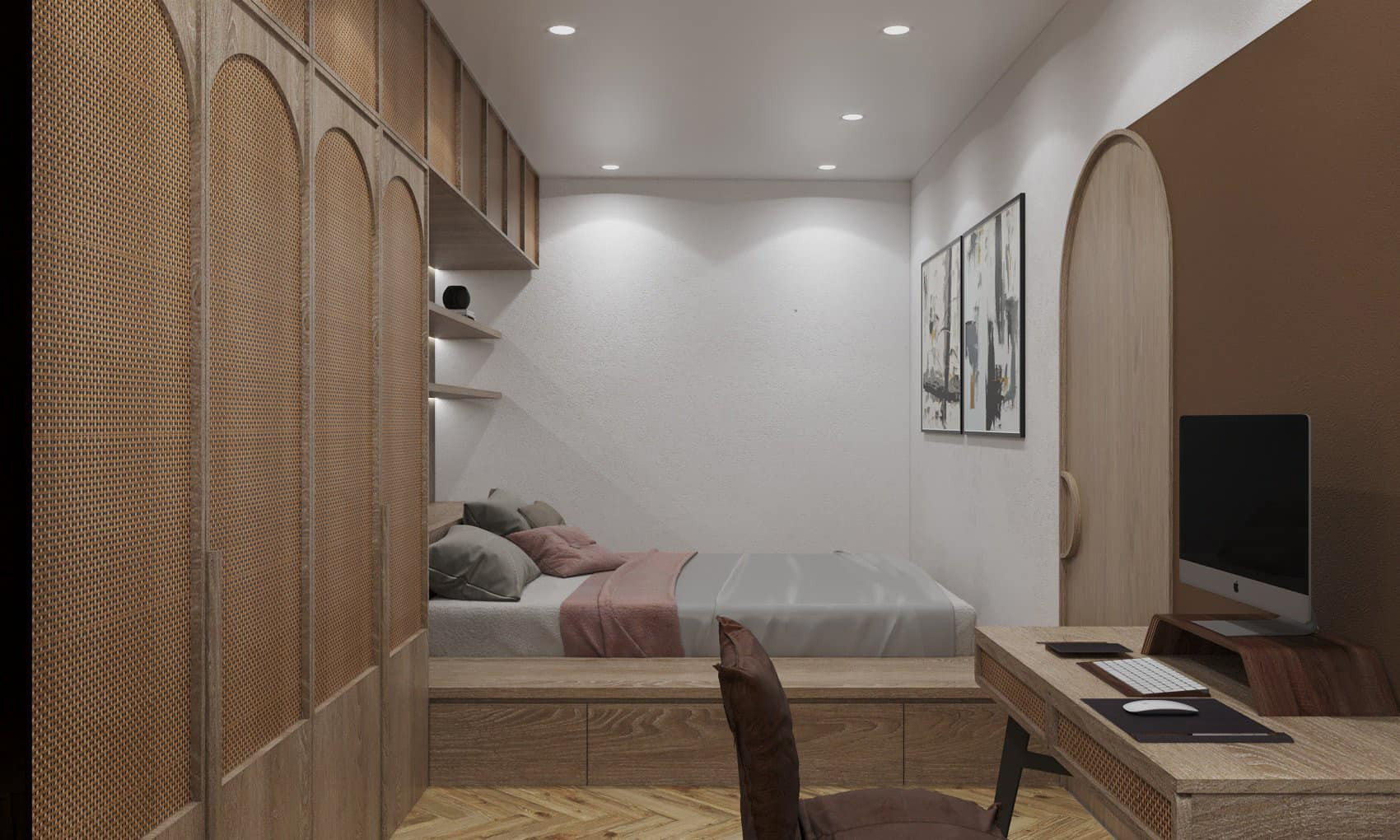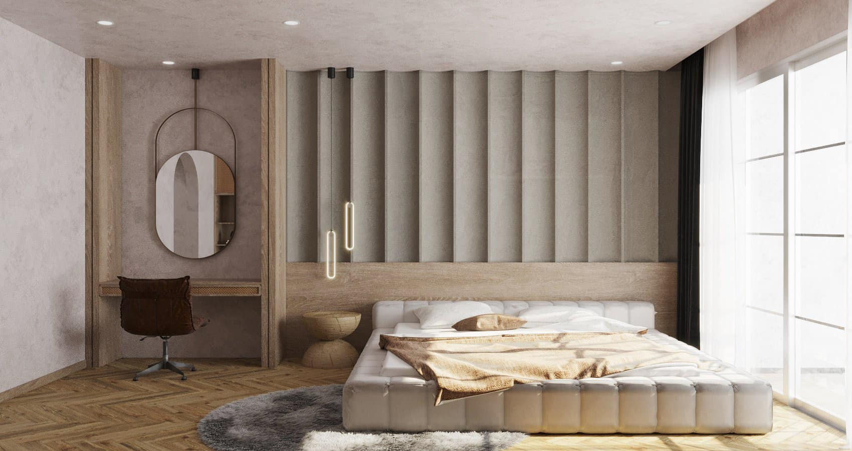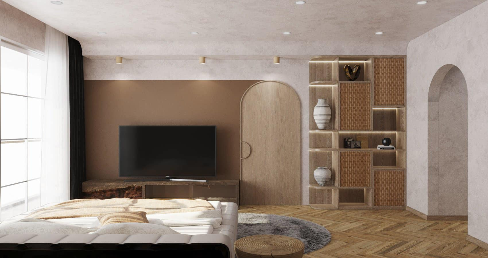 Phòng ngủ dùng gam nâu ấm và xám. Mảng tường thạch cao lượn sóng và giường ngủ làm mềm đi những hình khối góc cạnh của cửa kính, tủ kệ.