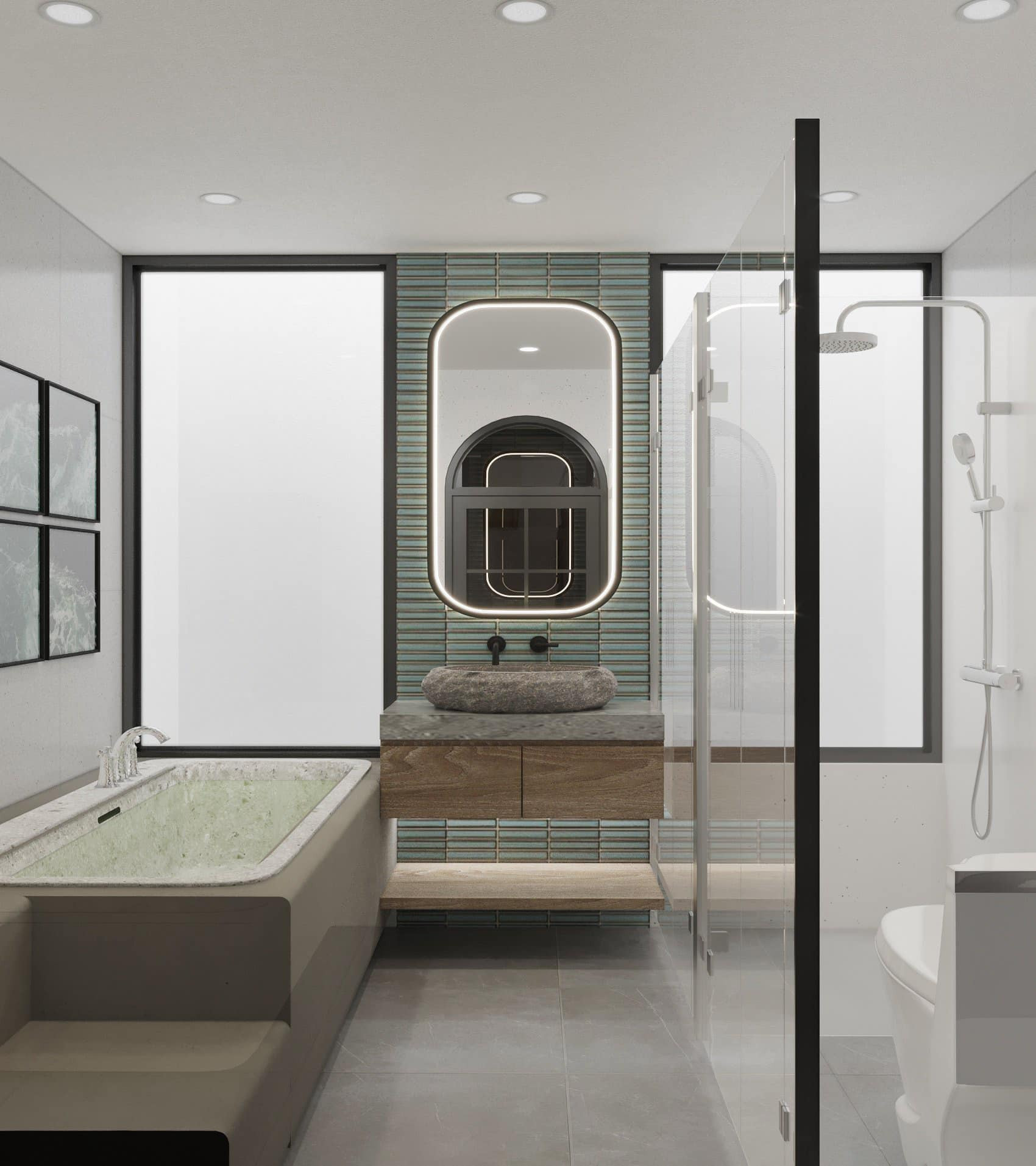 Phòng vệ sinh tiêu chuẩn 5 sao, đủ thiết bị và mang yếu tố nghỉ dưỡng. Không gian luôn khô ráo nhờ cửa sổ thông ra giếng trời lớn.