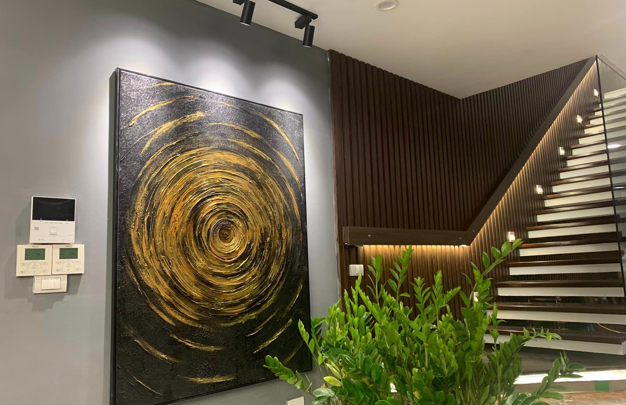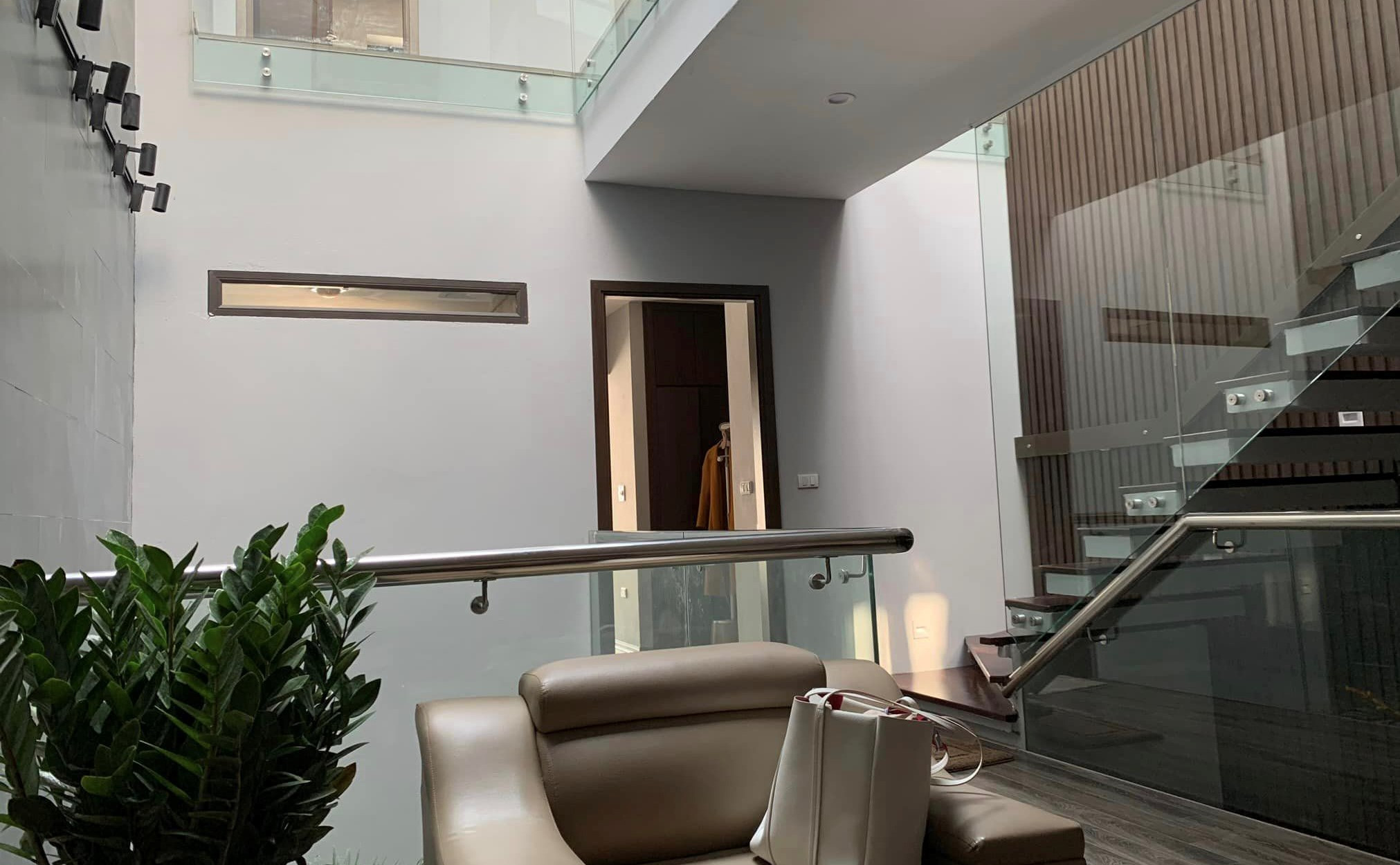 Ngôi nhà rực rỡ vào buổi tối. Kệ trang trí ở cầu thang có tác dụng làm đẹp nhưng cũng là mẹo phong thủy, tránh cầu thang bị đâm ra cửa.