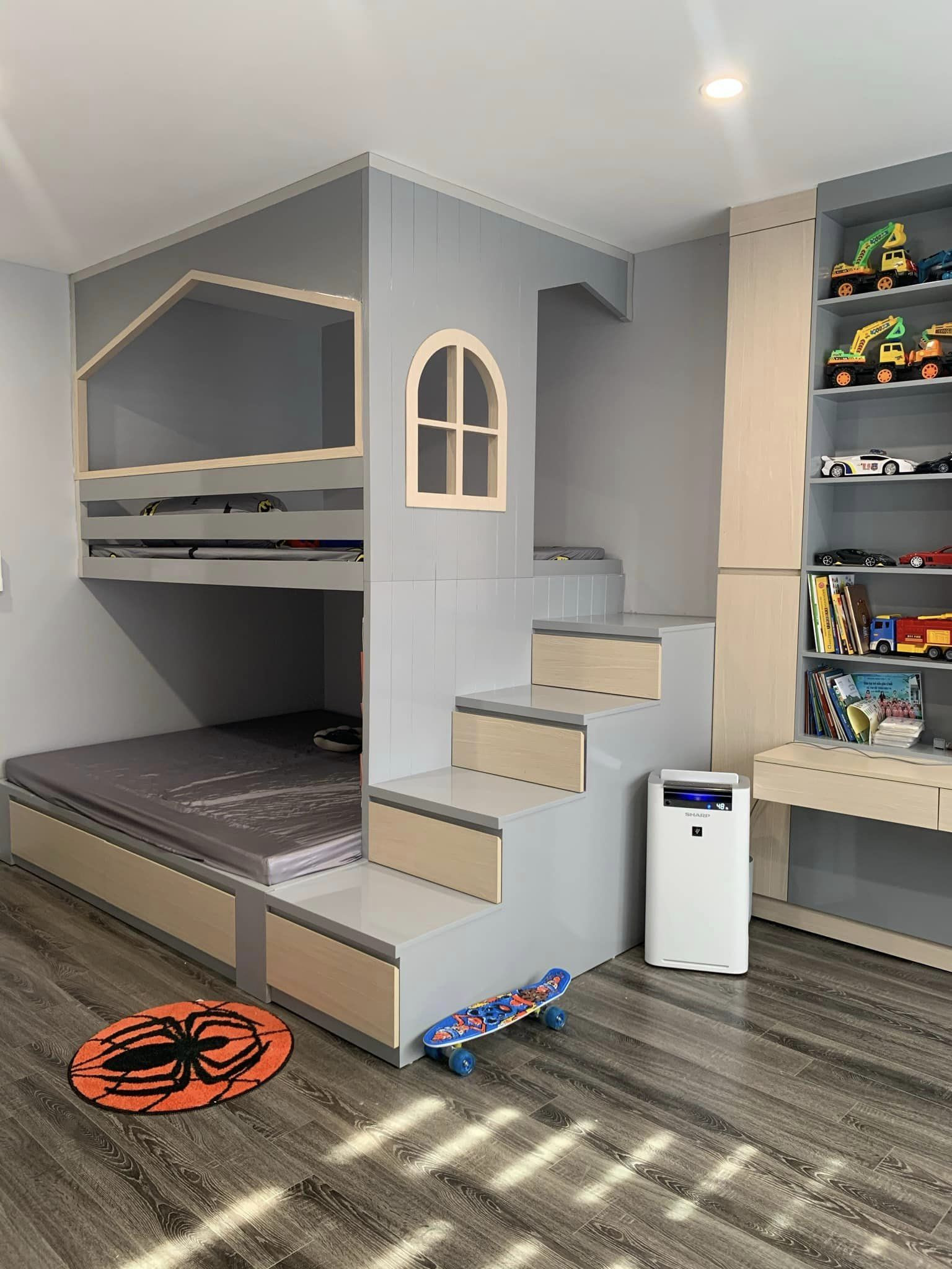 Phòng ngủ em bé đầy cá tính với thiết kế nhiều hộc tủ cất đồ ngăn nắp.