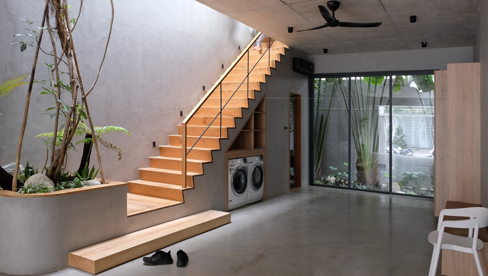 Tầng dưới là nơi để xe và không gian vệ sinh, giặt sấy. Khi đi làm về, gia chủ có thể vệ sinh, thay giầy dép, quần áo dưới tầng trệt mà không ảnh hưởng đến người sinh hoạt phía trên. Ngoài ra khi bắt đầu đi làm gia chủ có thể thay đồ, vệ sinh ở tầng trệt rồi đi làm luôn, không cần phải lên lầu.