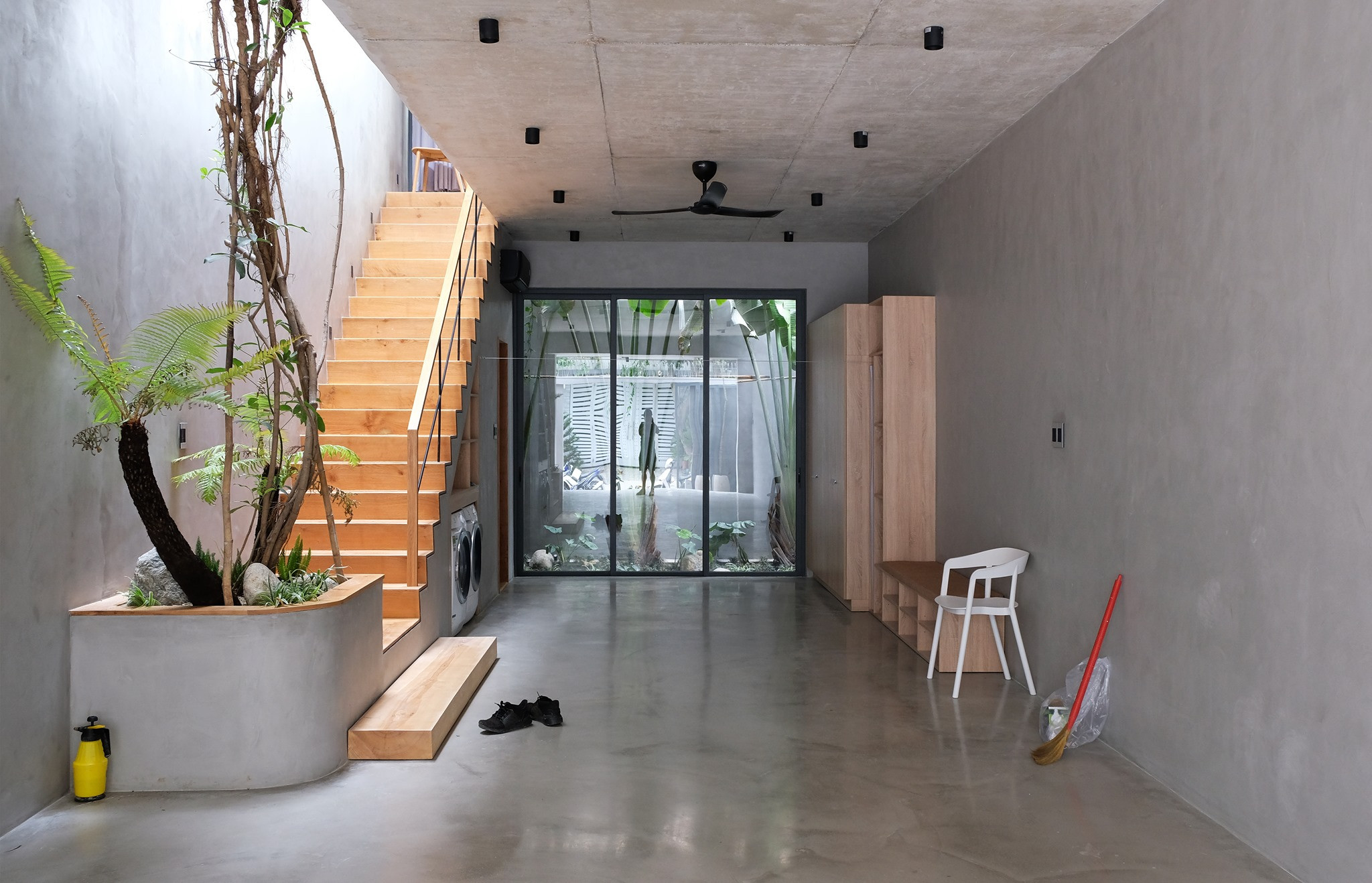 Khác với nhiều công trình hướng Tây khác, các kiến trúc sư thường bố trí mặt tiền khép kín, hạn chế trổ cửa sổ để giảm bớt sự ảnh hưởng của nắng hướng Tây nhưng đối với công trình này, yêu cầu của chủ nhà muốn thông thoáng nên anh An trổ cửa lớn nhất có thể.