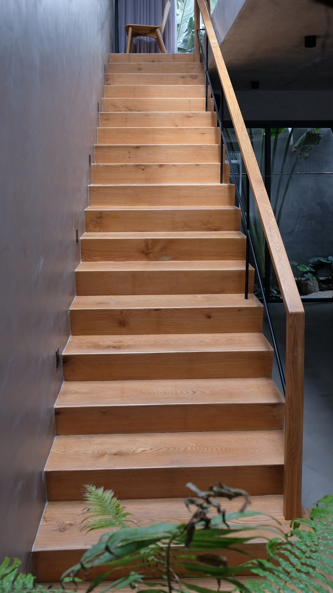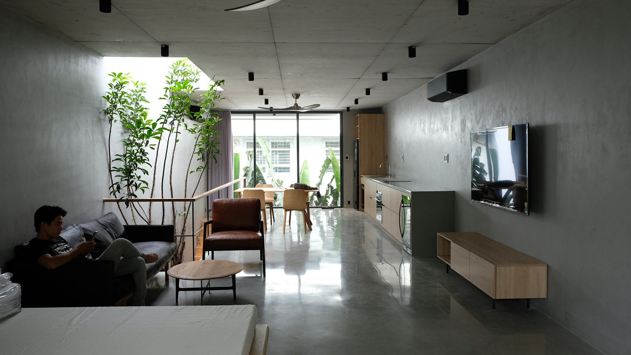 Tầng trên được ưu tiên toàn bộ không gian cho những sinh hoạt thiết yếu của ngôi nhà như nấu nướng, ăn uống, ngủ nghỉ, thư giãn... Trần nhà đổ bê-tông, để nguyên bản rồi phun lớp chống bụi. Phần đèn điện sử dụng đèn ống bơ hắt sáng, màu vàng ấm áp. Ngoài ra, nhóm thiết kế còn đưa vào nhà khoảng giếng trời nhỏ nhằm tạo luồng gió đối lưu thông suốt. Các phòng không ngăn cách bởi các tường vừa thô cứng vừa làm hẹp không gian, mà ngăn cách ước lệ bằng các tấm rèm, lúc cần có thể tạo ra sự riêng tư cần thiết, lúc không cần, rèm được kéo ra tạo cho ngôi nhà thông thoáng tối đa. Ngoài ra mặt tiền và phía sau nhà được trổ cửa rộng để lấy gió mát và ánh sáng tự nhiên. Khu relax thú vị. Sàn nhà bằng bê-tông mài mộc mạc, xưa cũ. Phòng tắm sử dụng khung cửa sổ rộng, phía trước là hàng cây xanh cản nhiệt. Khi cần sự kín đáo, gia chủ có thể kéo rèm sáo xuống.