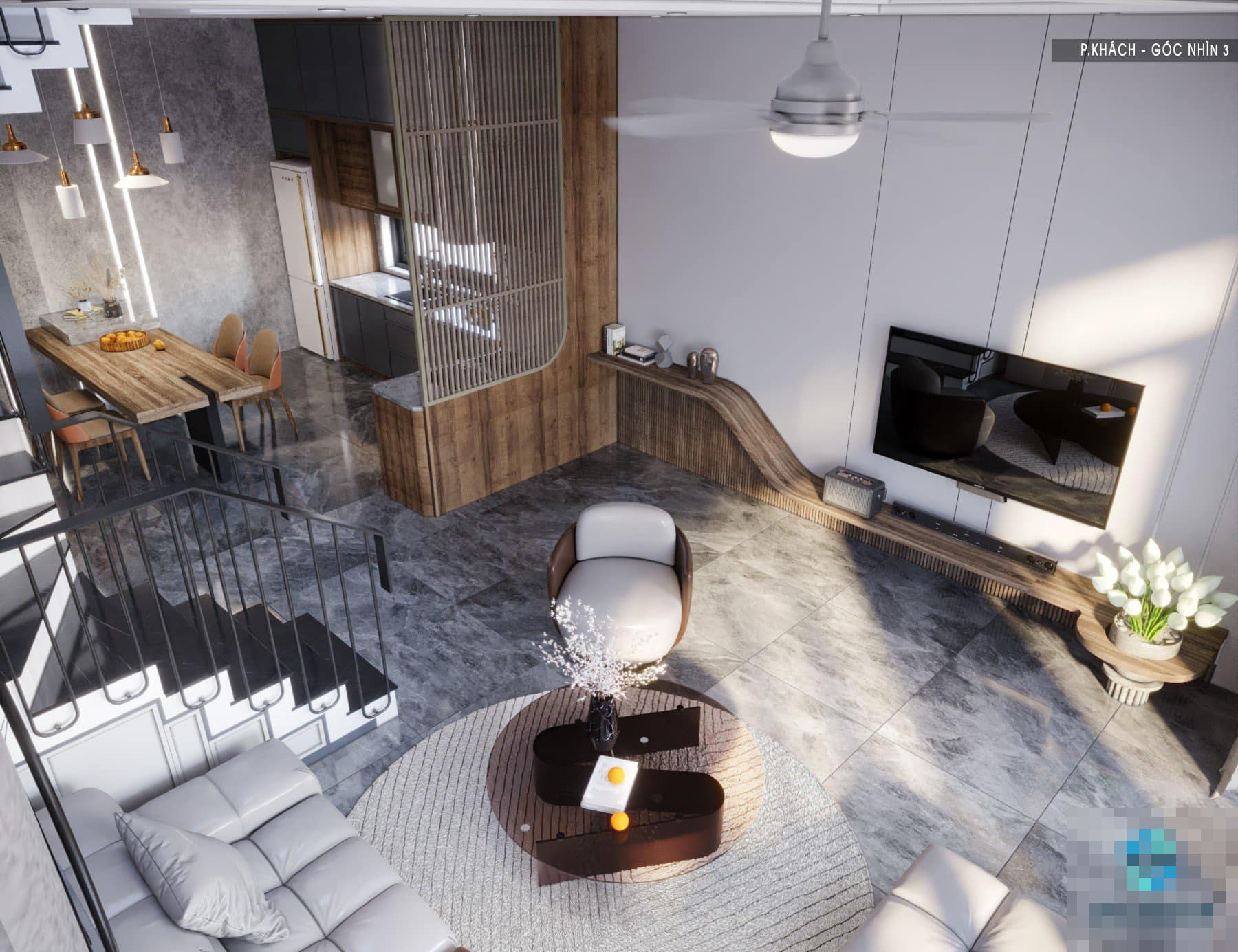 Bếp và khách thiết kế không gian mở, chỉ ngăn bằng tấm lam gỗ mỏng.