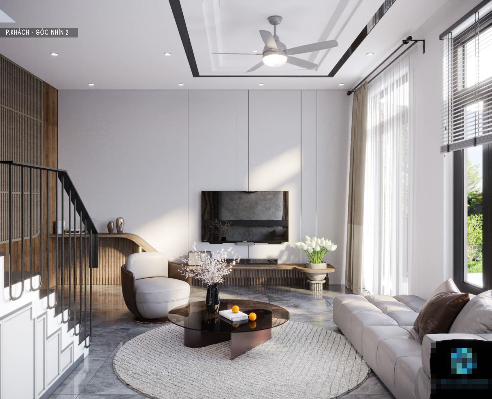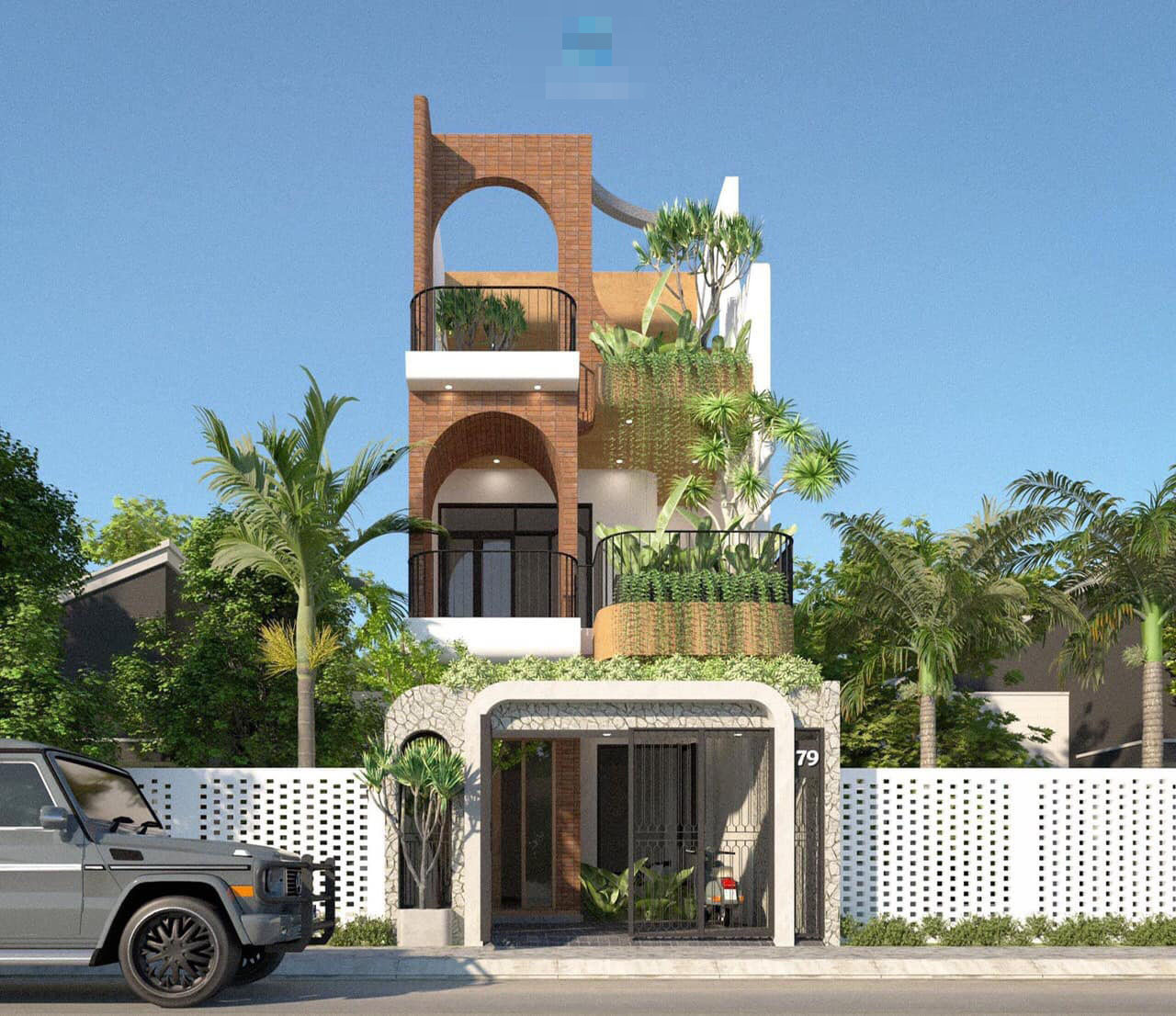 Ngôi nhà tầng có sân cổng để xe. Bụi cúc tần Ấn Độ theo thời gian sẽ phát triển và rủ xuống như lớp rèm cản tia bức xạ mặt trời. Tầng ba trồng một cây thần tài núi để cảnh quan thêm đẹp. Những bức tường vòm giúp làm mềm mại sự thô cứng của bê tông và hình khối.