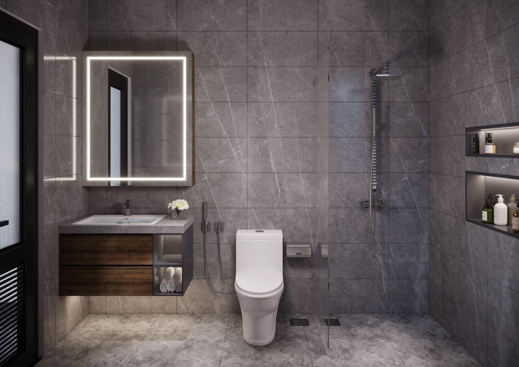 Phòng tắm vừa đủ để bố trí công năng tiện nghi: Vách tắm kính, vòi sen đứng, tủ gỗ, gương đèn led. Màu xám của gạch ốp lát