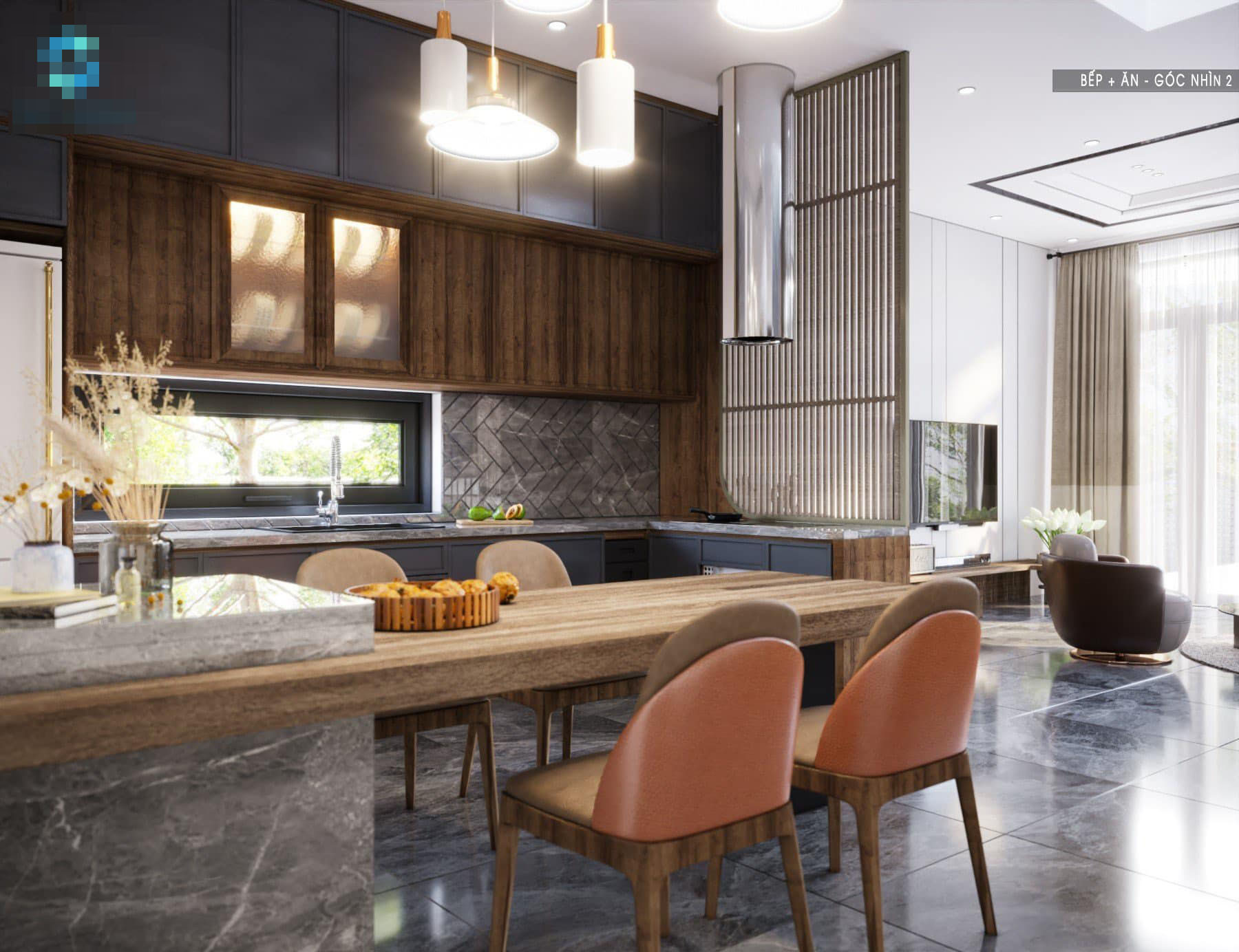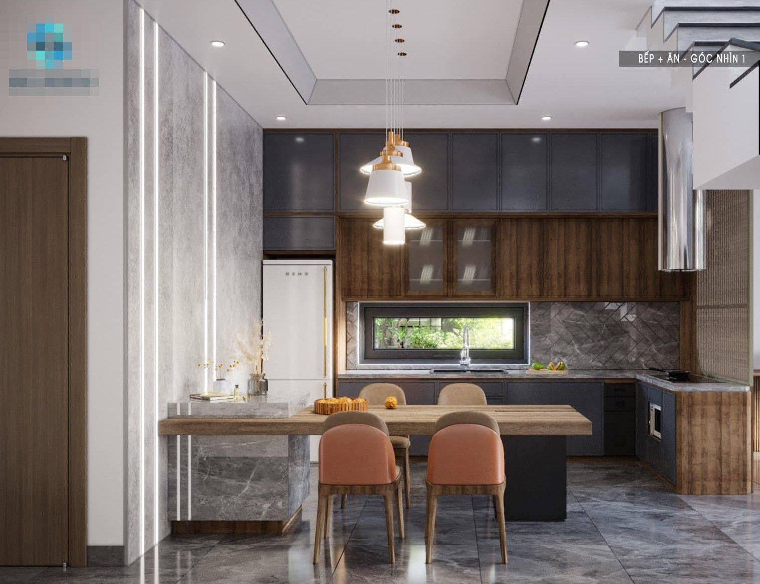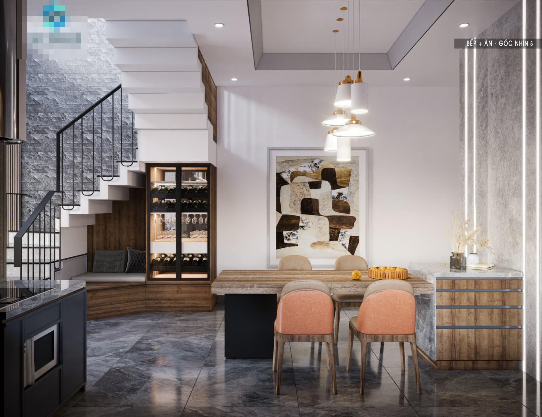 Bàn đảo kết hợp bàn ăn. Phía dưới bàn đảo có thêm hộc tủ, gia tăng diện tích lưu trữ cho gia chủ. Gầm cầu thang thiết kế tủ rượu và ghế ngồi chơi tiện dụng.