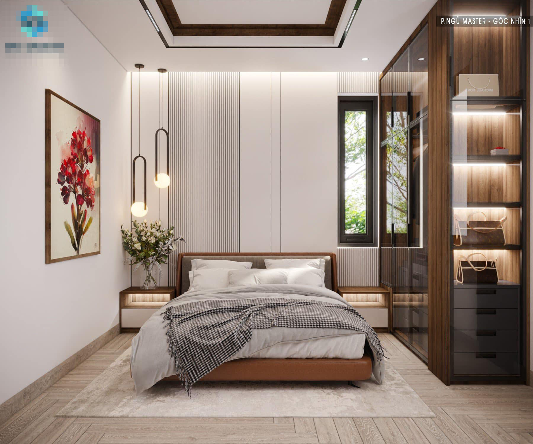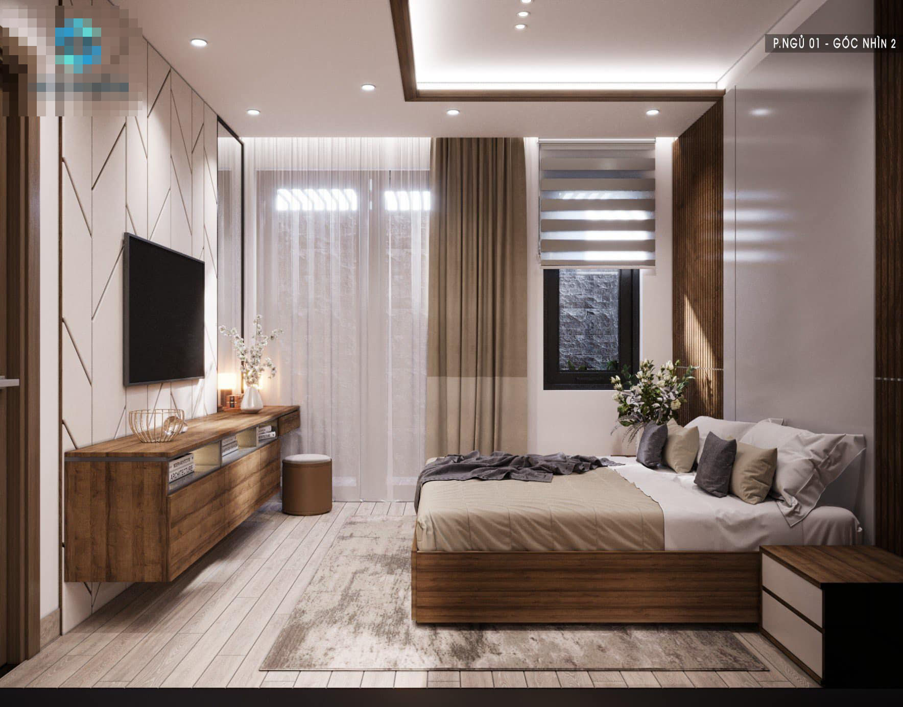 Phòng ngủ dùng gam trắng và nâu gỗ tối giản, ấm cúng.