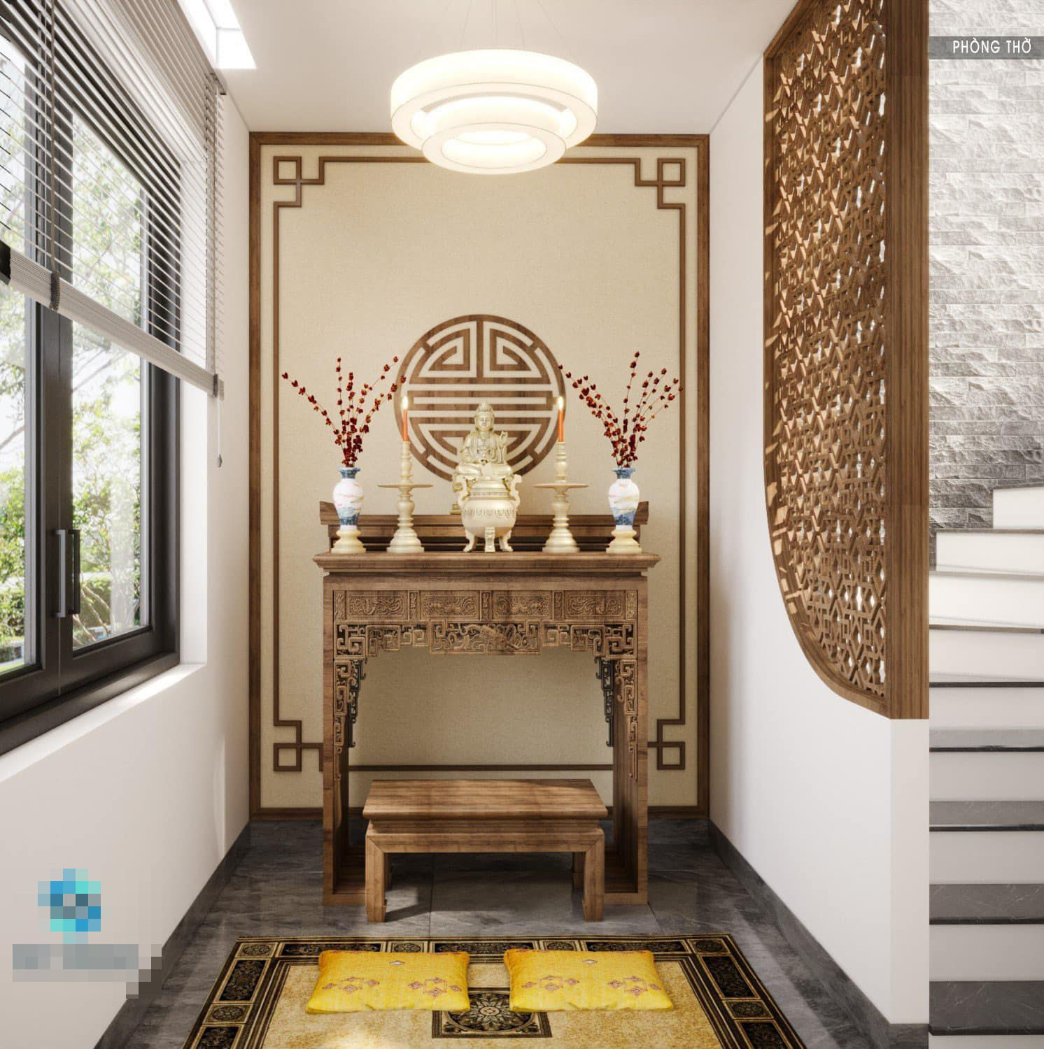 Phòng thờ thông với không gian bên ngoài nhưng do nằm trên tầng cao nên rất yên tĩnh.