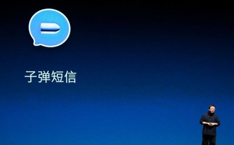 Luo Yonghao, CEO và là người sáng lập startup điện thoại thông minh Trung Quốc Smartisan, đang giới thiệu một ứng dụng nhắn tin tức thời mới Bullet Messenger trong một sự kiện ra mắt tại Bắc Kinh, Trung Quốc Ảnh: Reuters |