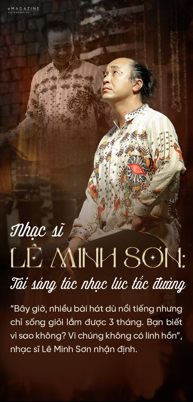 Tôi vẫn sáng tác theo từng dự án. Nói có khi bạn chả tin đâu, có tháng tôi viết 18 tác phẩm. Tôi sáng tác lúc nào ư? Là những khi tắc đường đấy! Lê Minh Sơn chả bao giờ cảm thán về vấn nạn này dù ngày nào cũng mất 3 tiếng chịu trận. Đa phần ý tưởng về những show diễn lớn lại đến từ khoảng thời gian tưởng như bế tắc, trì trệ đó. Tôi bật máy ghi âm lên để lưu lại mọi câu nói, suy nghĩ của chính mình, sau đó chắt lọc và hoàn thiện.