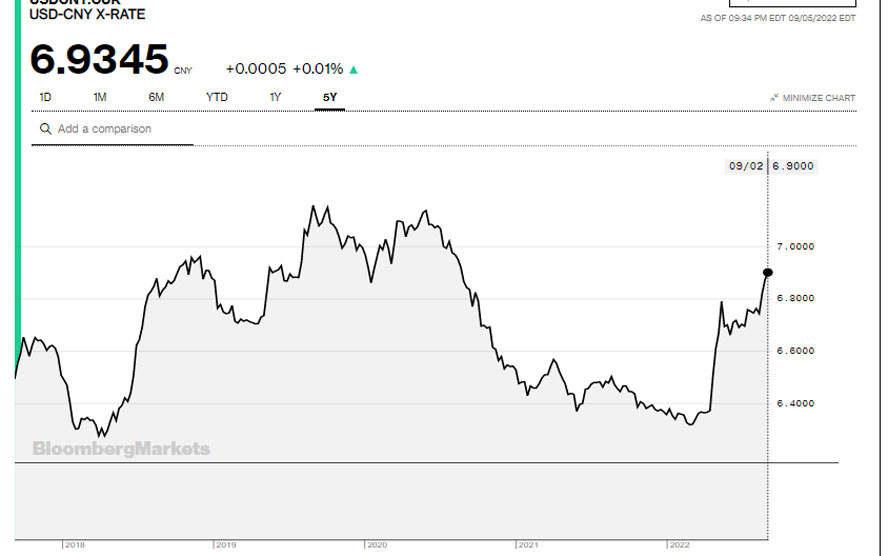 Tính tới sáng 6/9, đồng Nhân dân tệ đã xuống mức 6,9345 NDT đổi 1 USD, thấp hơn rất nhiều so với mức 6,3671 hồi giữa tháng 4/2022. Tổng cộng, NDT đã mất giá gần 9% trong vòng 5 tháng.