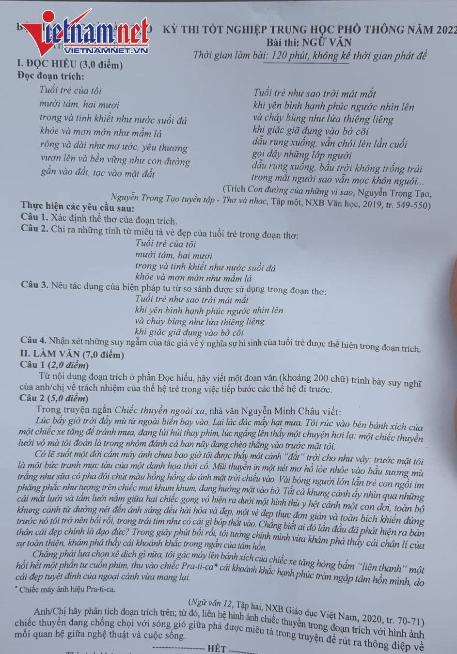 Về đề thi Ngữ Văn thi tốt nghiệp THPT 2022, Th.S Hồ Tấn Nguyên Minh, Tổ trưởng tổ Ngữ Văn trường THPT chuyên Lương Văn Chánh (Phú Yên) nhận định: cấu trúc đề thi quen thuộc. Cấu trúc gồm 2 phần: phần đọc hiểu (3 điểm), phần làm văn (7 điểm) với 2 câu: câu nghị luận xã hội (2 điểm) và câu nghị luận văn học (5 điểm). Đây là cấu trúc ổn định trong những năm gần đây, học sinh đã rất quen thuộc với cấu trúc này nên sẽ không cảm thấy bỡ ngỡ.
