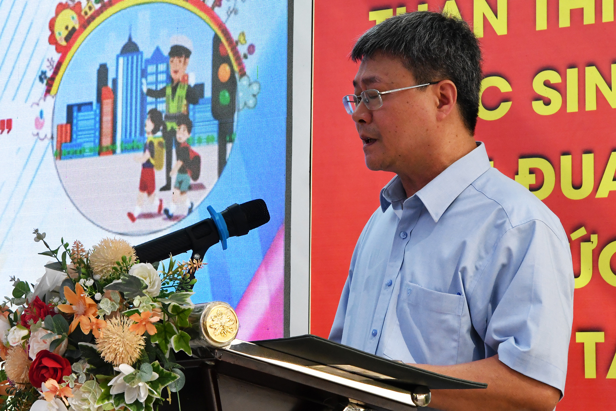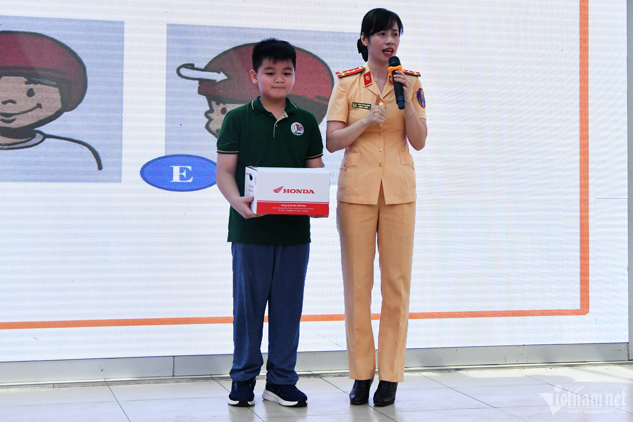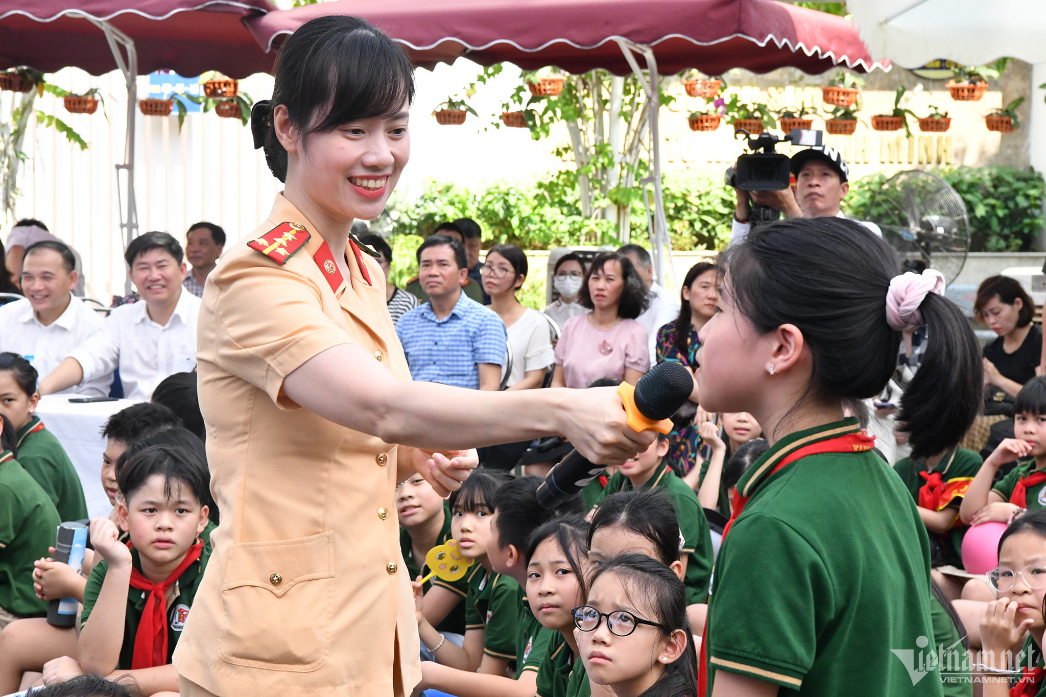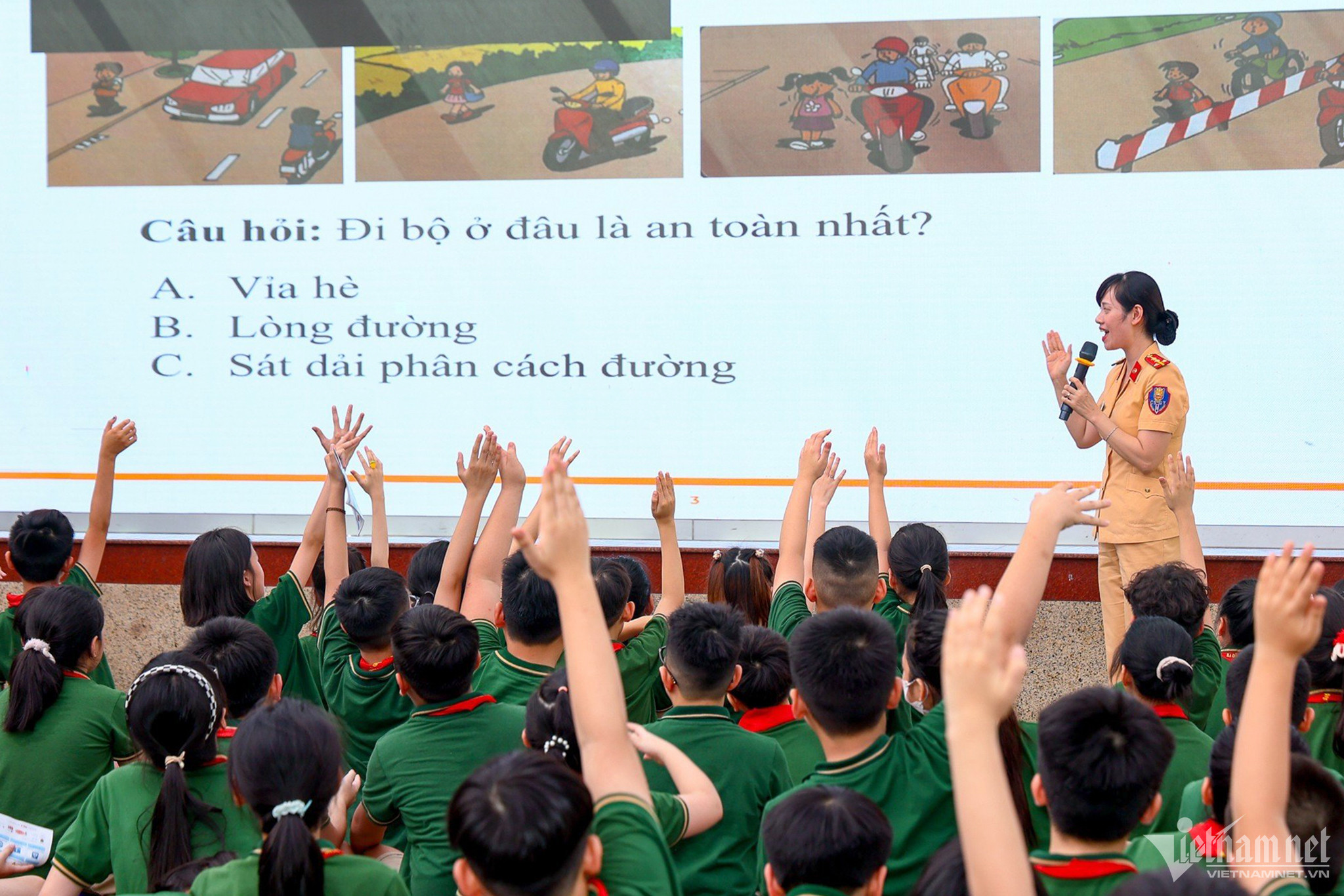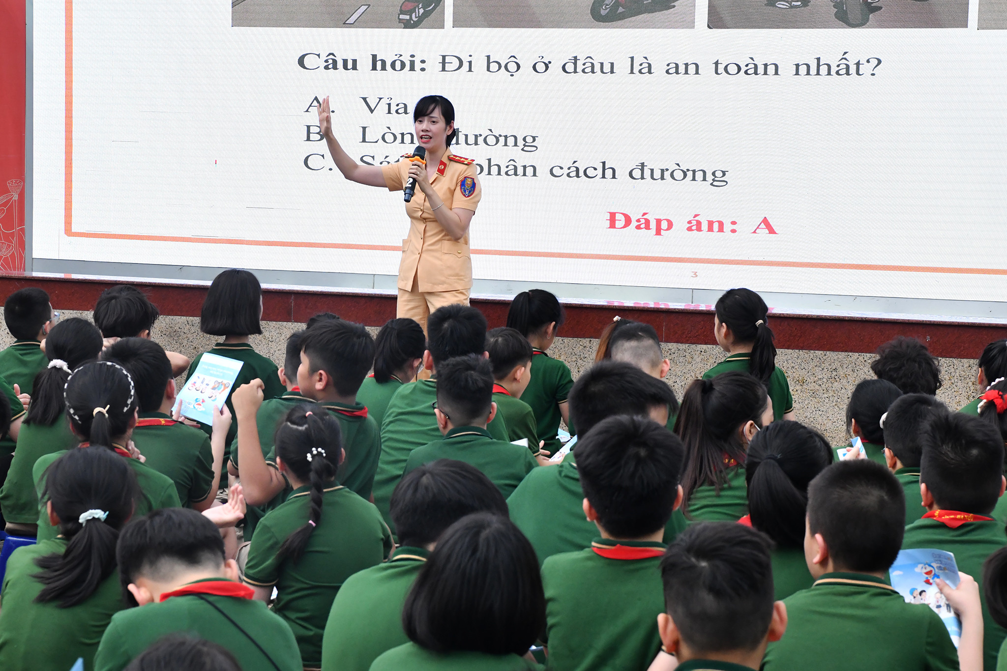 Đại úy Trần Thanh Bình, Cán bộ Cục CSGT phổ kiến thức về an toàn giao thông cho các em học sinh, với cách truyền đạt dí dỏm dễ hiểu đã khiến các em học sinh dễ tiếp thu và hào hứng, sôi nổi trong trả lời các câu hỏi.