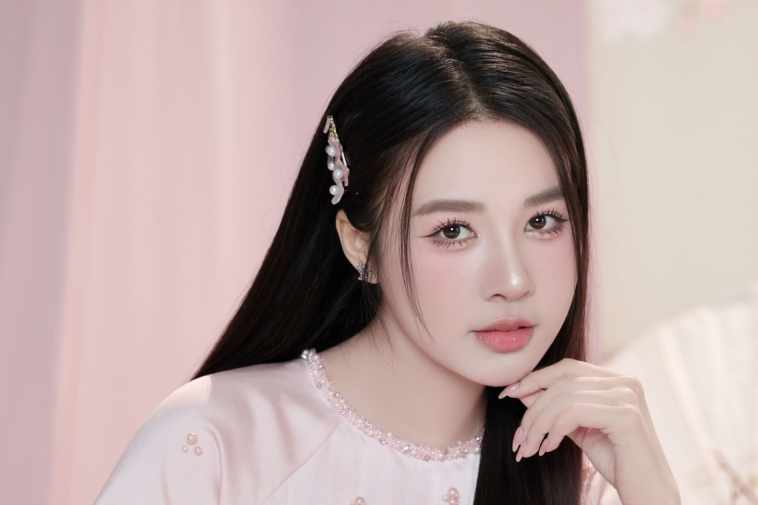 Người đẹp lựa chọn lối trang điểm trong veo, nhấn nhẹ vào đôi mắt và làn môi hồng tự nhiên, tôn lên gương mặt thanh tú. Mái tóc dài uốn nhẹ, buông xõa giúp tăng vẻ dịu dàng, nữ tính. Bộ ảnh tiếp tục thể hiện sự nhất quán trong phong cách mà cô theo đuổi - thanh lịch, tinh tế nhưng vẫn có dấu ấn riêng.