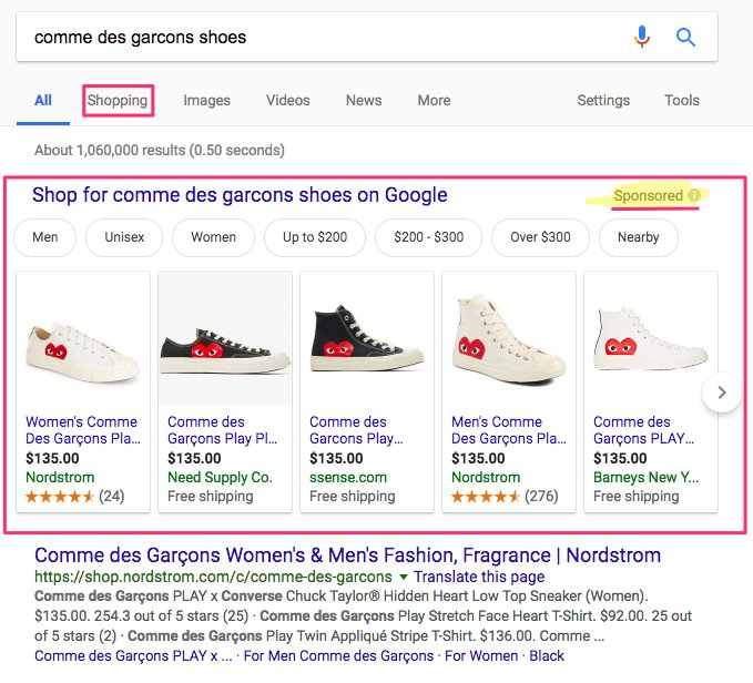 Cũng giống như công cụ tìm kiếm khổng lồ của mình, Google Shopping cũng là một dạng trang web quảng cáo. Đơn giản như nếu bạn muốn mua một máy ảnh hay giày thể thao mới và bắt đầu tìm kiếm trên Googgl, một danh sách quảng cáo có thể hiện ra. Và khi bạn nhấp vào tab "Mua sắm - Shopping" trên Google, bạn sẽ được chuyển đến một trang mới - nơi có thể tìm kiếm sản phẩm theo giá, màu hoặc kích thước. Nếu như bạn không nhìn thấy thẻ thông báo "Được tài trợ" ở góc sản phẩm, thì bạn hoàn toàn không nhận ra đây chỉ là danh sách quảng cáo mà thôi. Điều này có thể khiến bạn mua nhầm sản phẩm "ma" hoặc bị lừa.