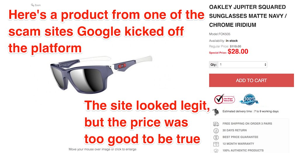 Lừa đảo bán hàng trên internet không còn là điều mới lạ, đặc biệt khi nói đến thương mại điện tử. Vấn nạn hàng giả cũng là một vấn đề phổ biến trên tất các nền tảng mua bán, bao gồm Amazon cũng đã phải vật lộn trong nhiều năm. Trước đây, người tiêu dùng khi đặt hàng qua Google Shopping, rồi sau đó chỉ nhận lại được những sản phẩm được sản xuất cẩu thả và không giống với ảnh trên mạng. "Chính điều này cũng gây khó khăn cho phía cảnh sát, nhưng Google đã giải quyết vấn đề bằng cách tích hợp các đánh giá của người bán và yêu cầu tất cả người bán phải đạt được điểm đánh giá tối thiểu mới được phép tham gia giao dịch"
