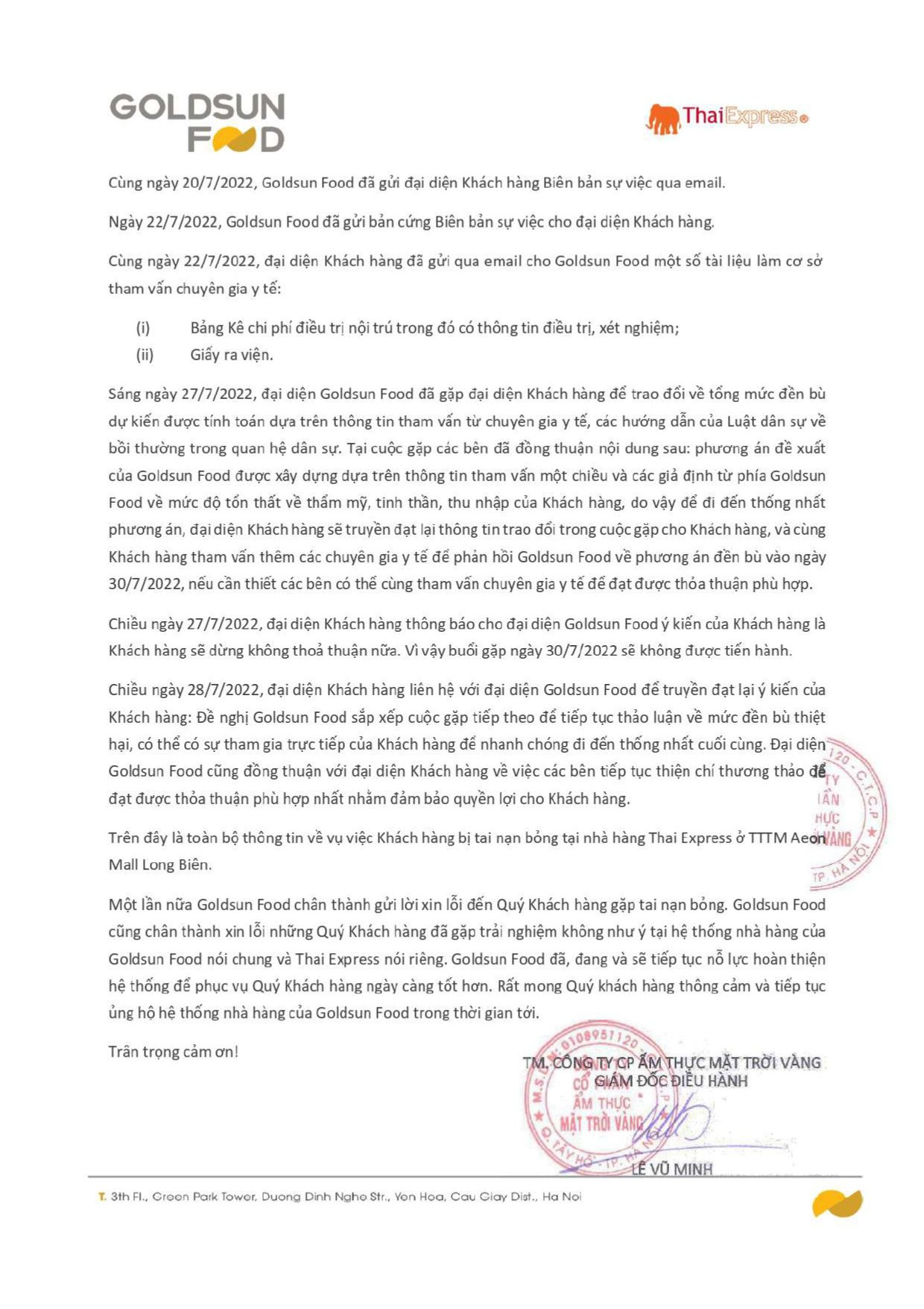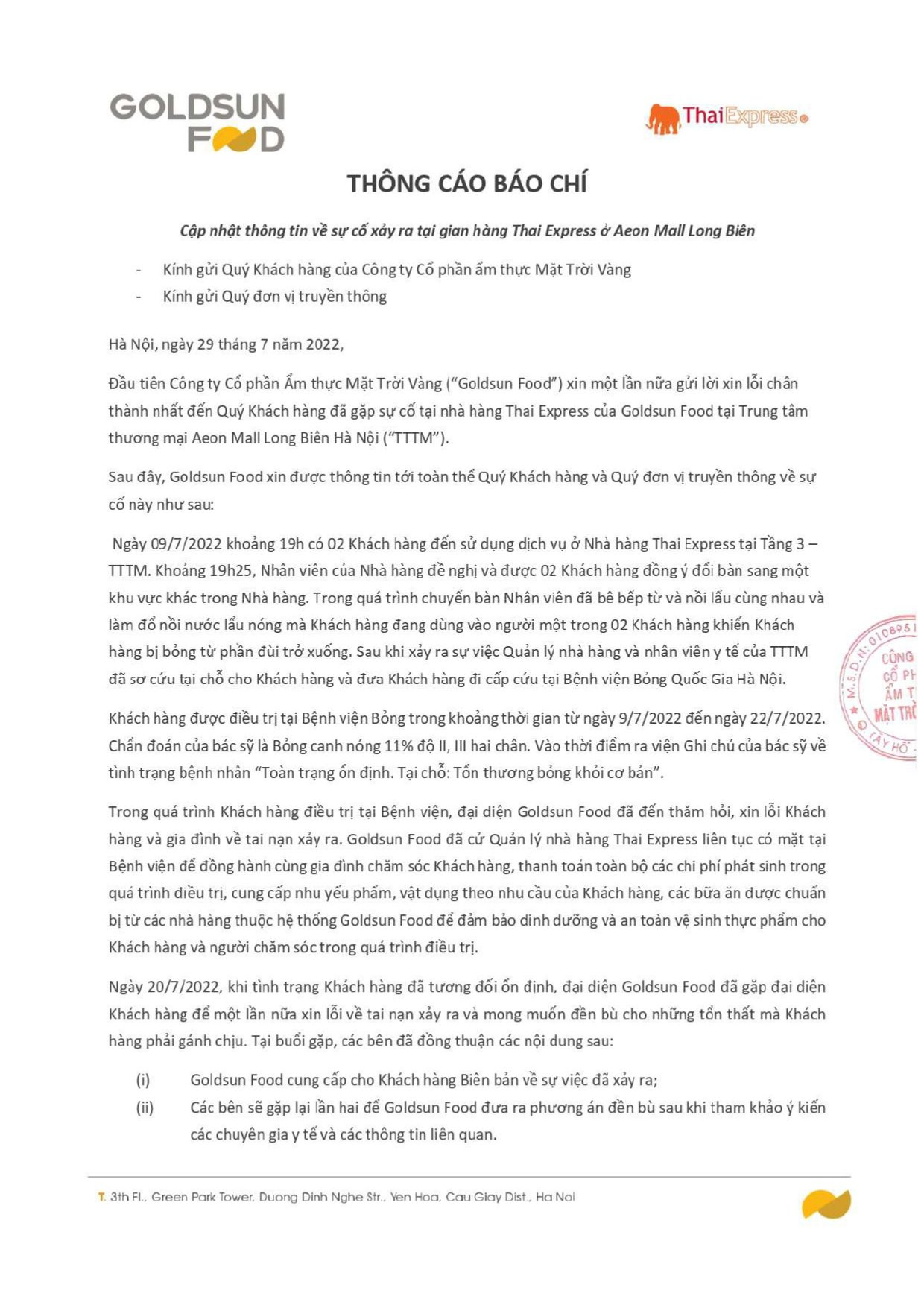 "Trong quá trình khách hàng điều trị tại bệnh viện, đại diện công ty đã đến thăm hỏi, xin lỗi khách hàng và gia đình về tai nạn xảy ra. Goldsun Food đã cử quản lý nhà hàng Thai Express liên tục có mặt tại bệnh viện để đồng hành cùng gia đình chăm sóc khách hàng, thanh toán toàn bộ các chi phí phát sinh trong quá trình điều trị, cung cấp nhu yếu phẩm, vật dụng theo nhu cầu của khách hàng...", đơn vị này thông tin.