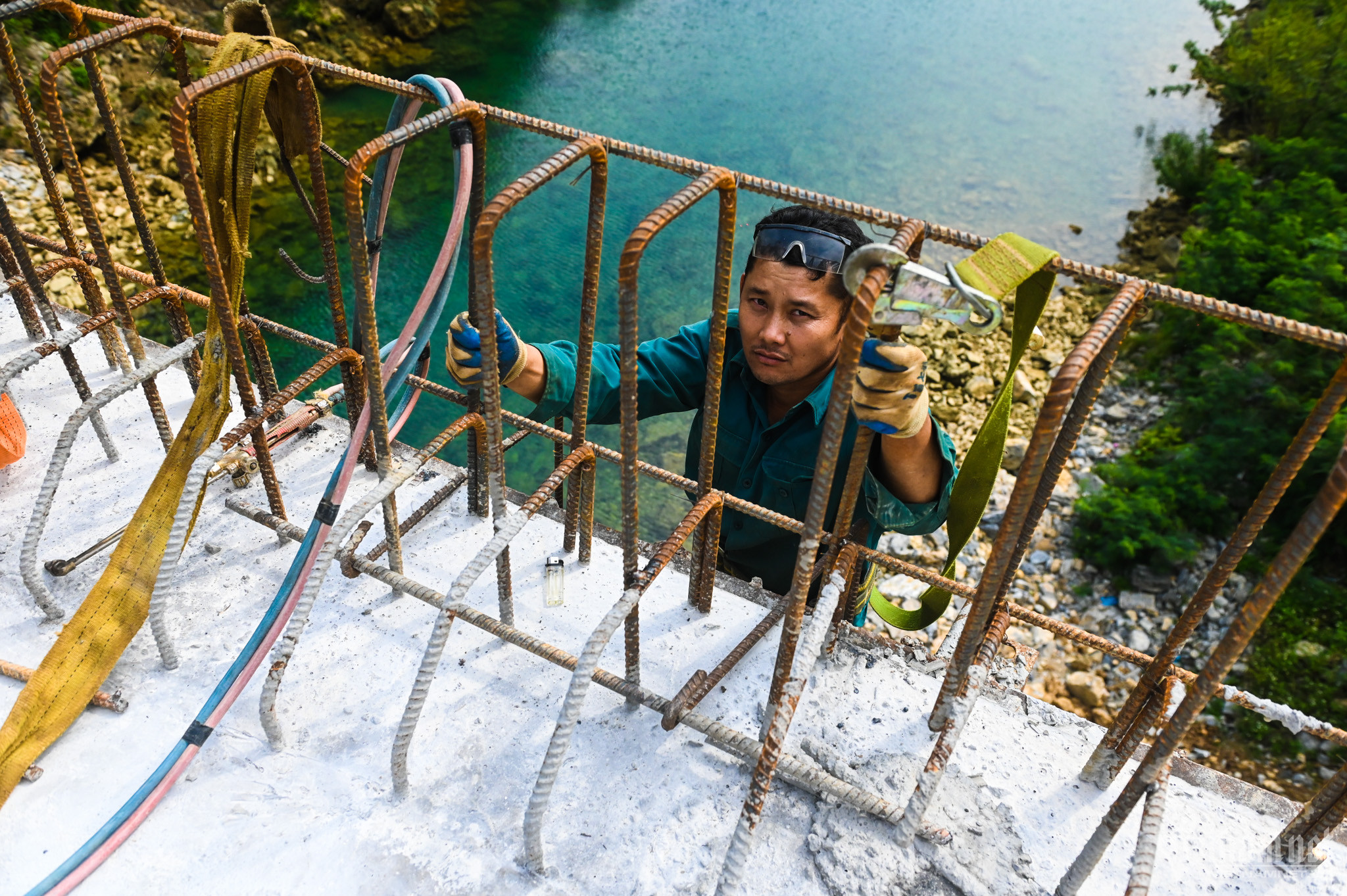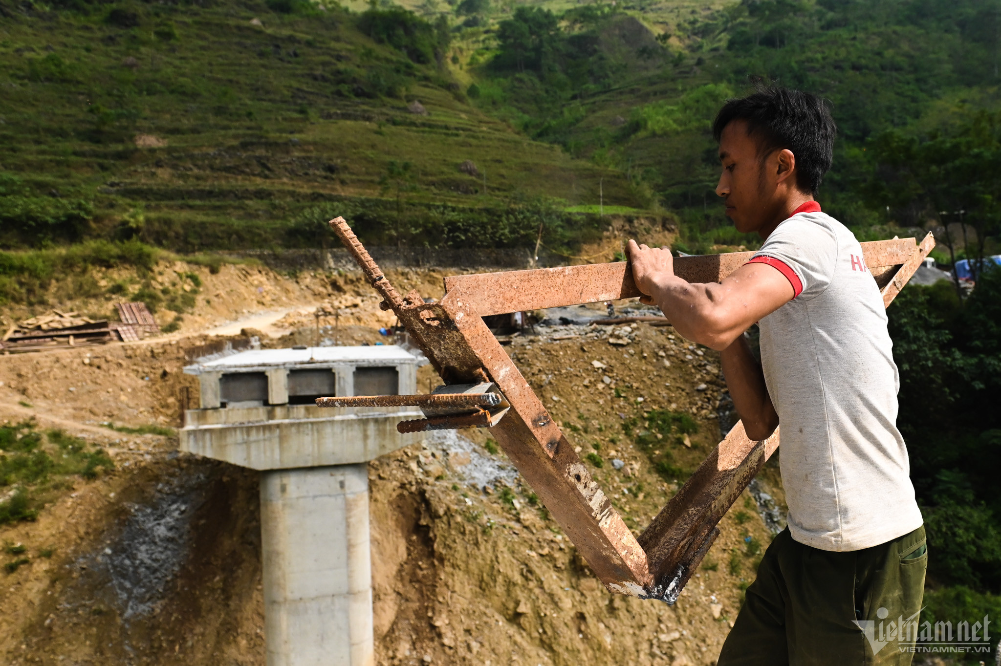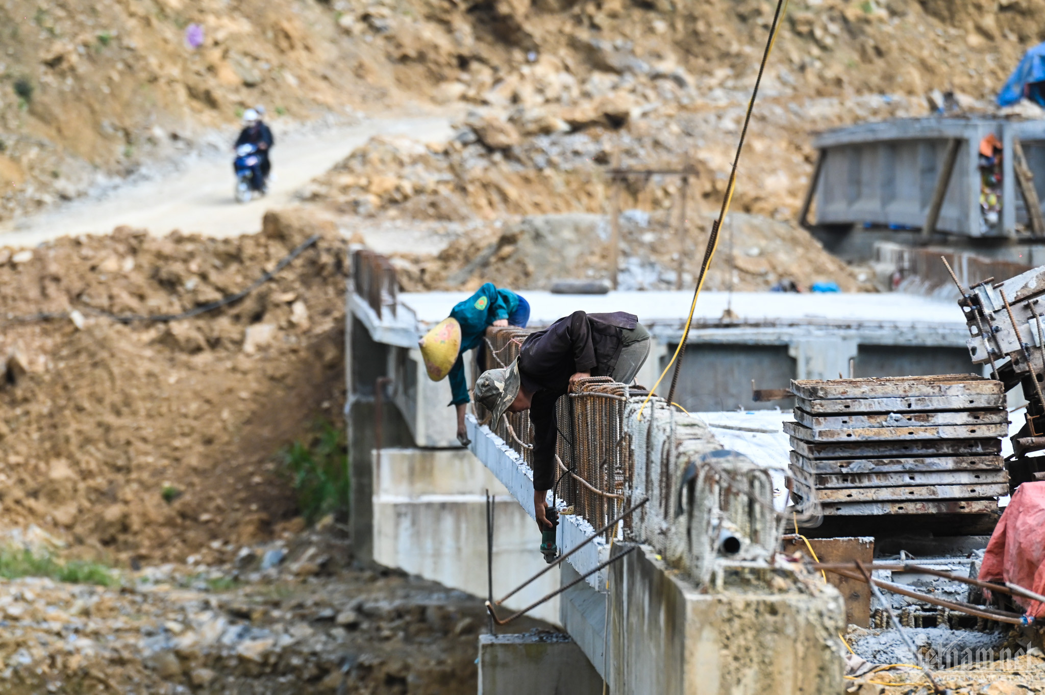 Công trình cầu Tràng Hương đang trong quá trình hoàn thiện, bắc ngang sông Nho Quế, nối thị trấn Mèo Vạc với cửa khẩu mới mở tại huyện này.