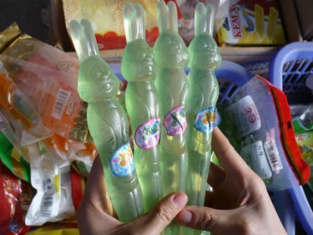 Khi xem sản phẩm thạch dài hình con thỏ thì chỉ có duy nhất một nhãn bằng chữ Trung Quốc, không có nhãn phụ tiếng Việt, thậm chí có những cây thạch mất nhãn, hoặc còn thì hoen ố. Loại thạch này không có hạn sử dụng.