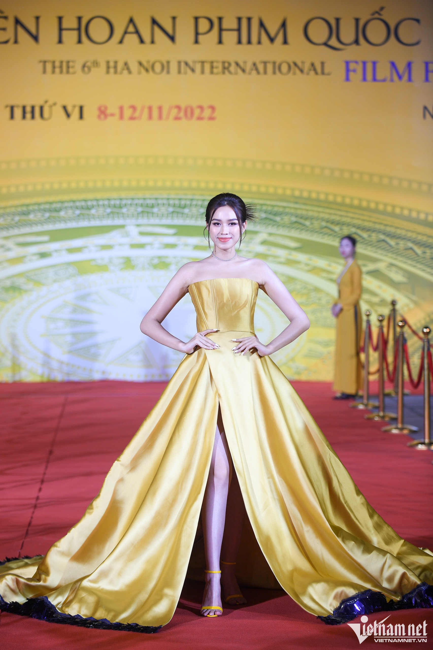 Hoa hậu Việt Nam Đỗ Thị Hà xuất hiện trên thảm đỏ với bộ váy dài với đường xẻ sâu màu vàng vô cùng bắt mắt.