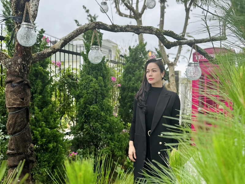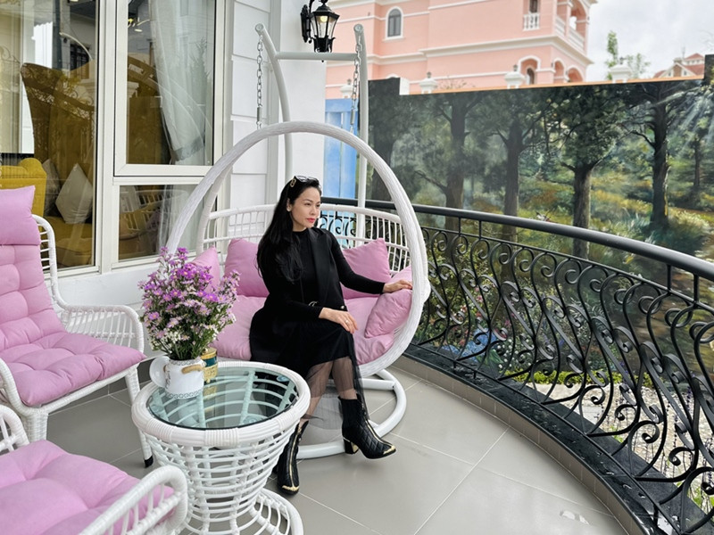 Nhật Kim Anh thích thú đứng ở ban công biệt thự, ngắm cảnh thiên nhiên trong lành, tận hưởng không khí mát mẻ trên đồi An Sơn. Buổi sáng dậy sớm, cô săn mây, đọc sách thư giãn, cà phê tán gẫu với bạn bè. Cô chia sẻ buổi tối tổ chức tiệc nướng ngay trong khu vườn xinh xắn.