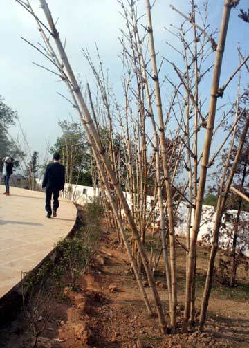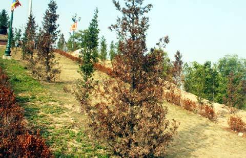 Khu vực trước tượng đài, nhiều cây lưu niệm cũng bị chết héo. Những cây may mắn còn chút sự sống thì tiêu điều xơ xác.