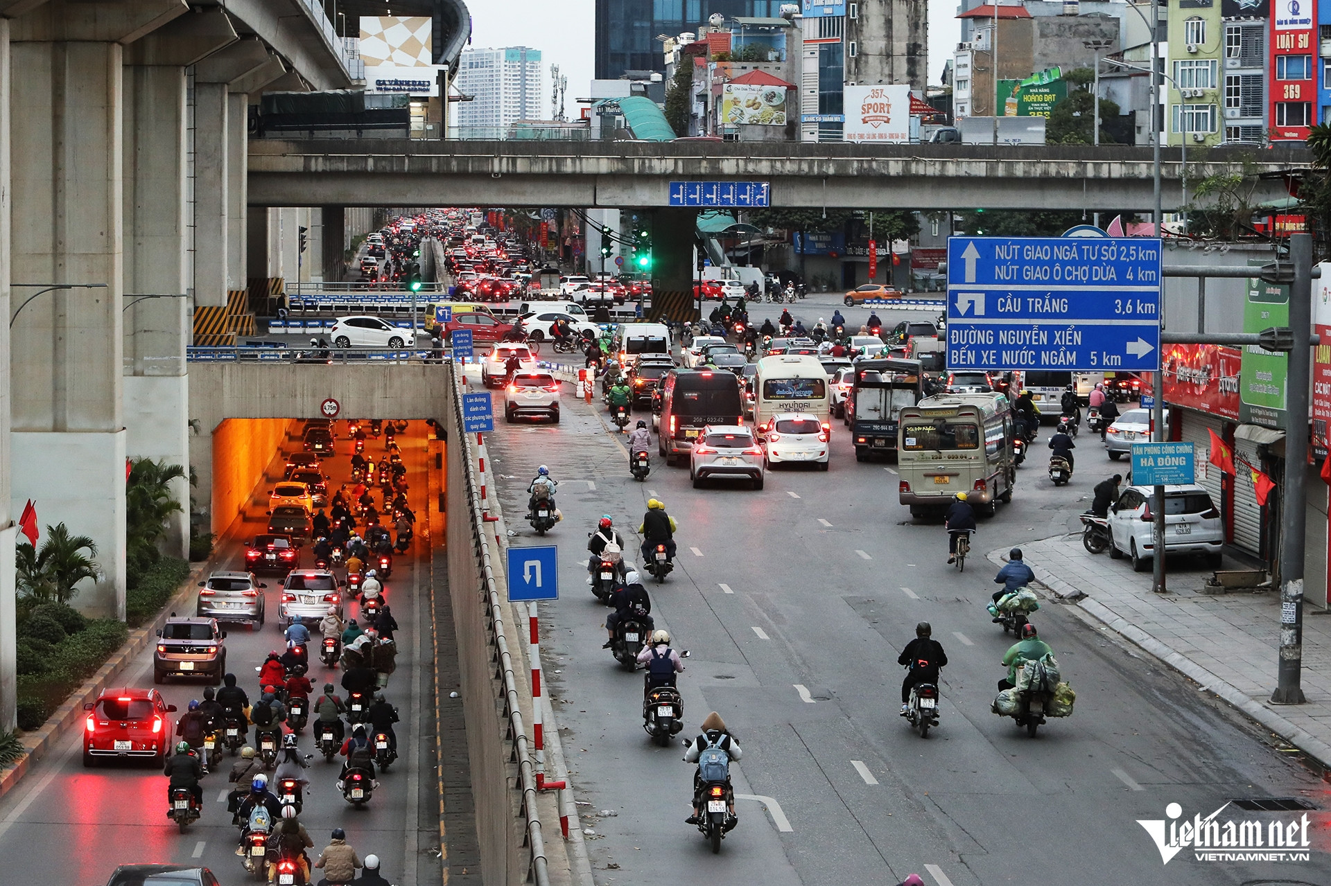 Lúc 7h, tại khu vực hầm chui Thanh Xuân (quận Thanh Xuân), lưu lượng phương tiện từ các huyện Thanh Oai, Chương Mỹ và quận Hà Đông hướng vào trung tâm thành phố gia tăng đáng kể.