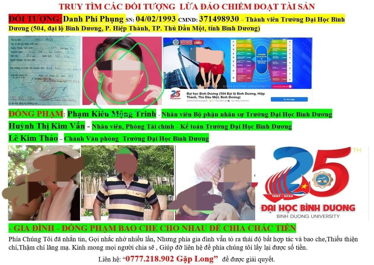 Trước đó, từ trưa cùng ngày, nhiều cán bộ trường ĐH Bình Dương (phường Hiệp Thành, TP Thủ Dầu Một) tá hỏa khi thấy hình của mình, đồng nghiệp cùng người thân trong gia đình bị cắt ghép, lồng ghép nội dung vu khống, sai sự thật đăng tải trên mạng xã hội.