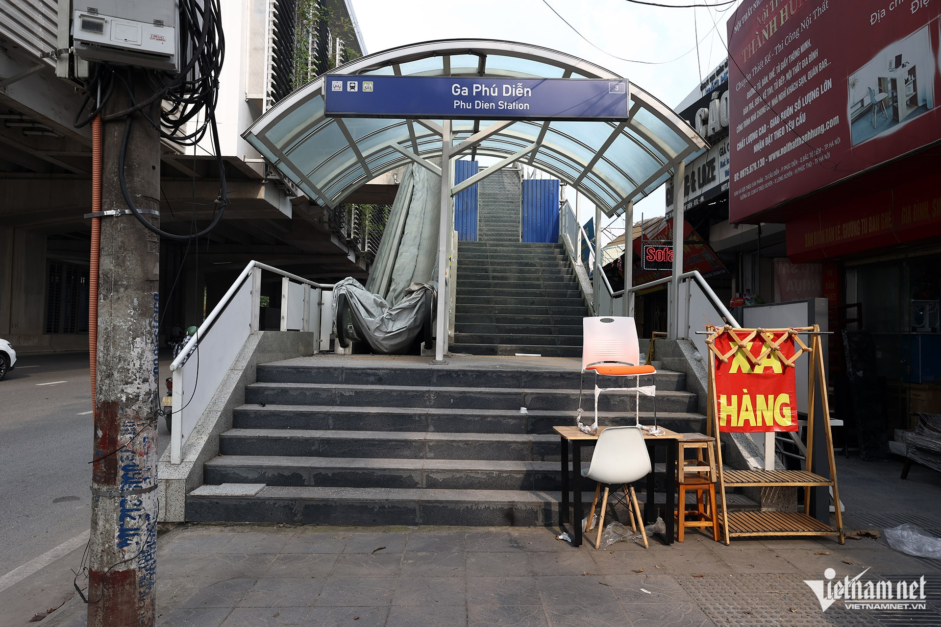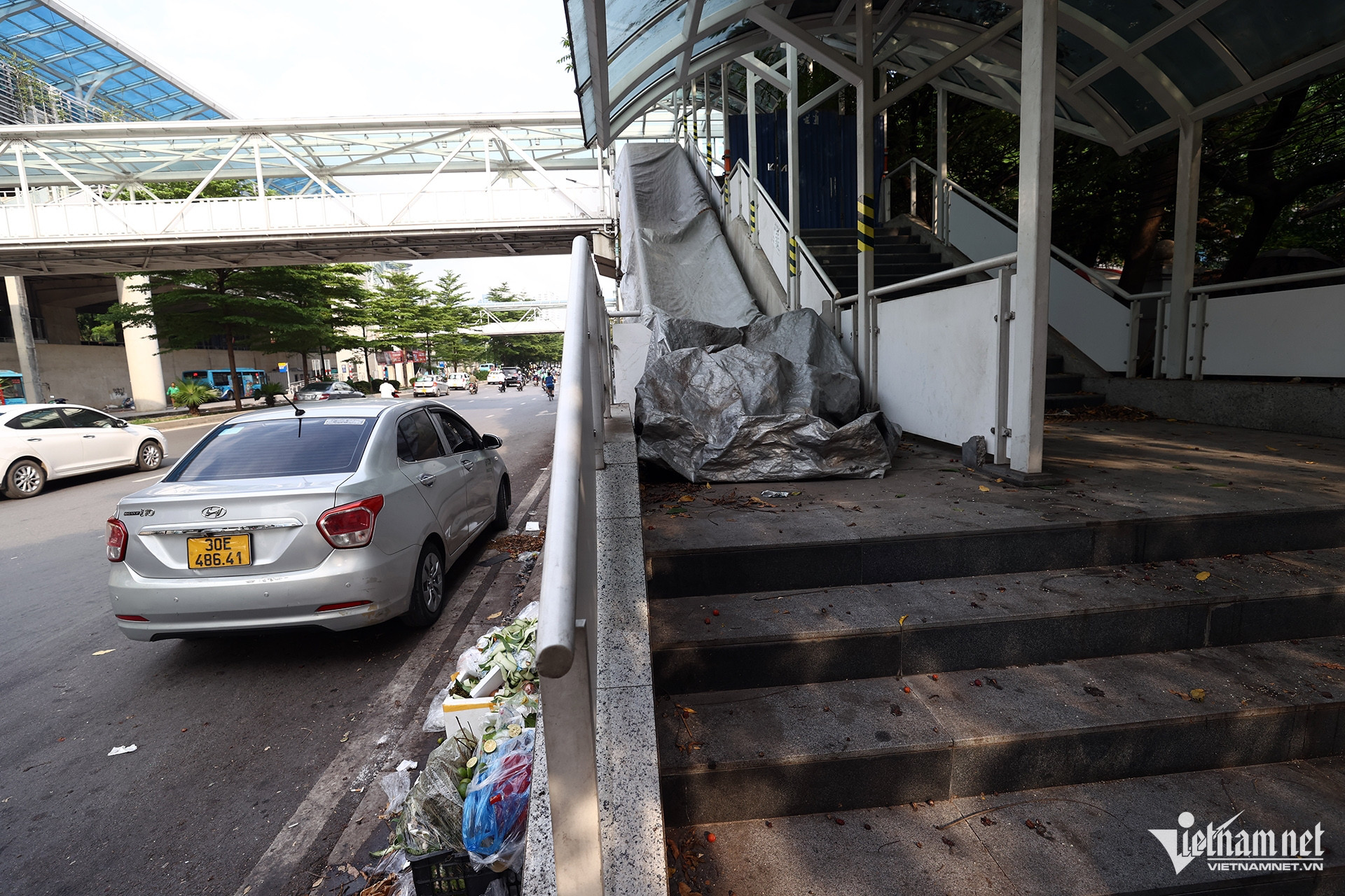 Tại ga S8 - Cầu Giấy (ga cuối của đoạn trên cao) chiều 5/8, lối lên xuống có nhiều rác thải; thang máy, thang cuốn được phủ bạt che chắn bụi.
