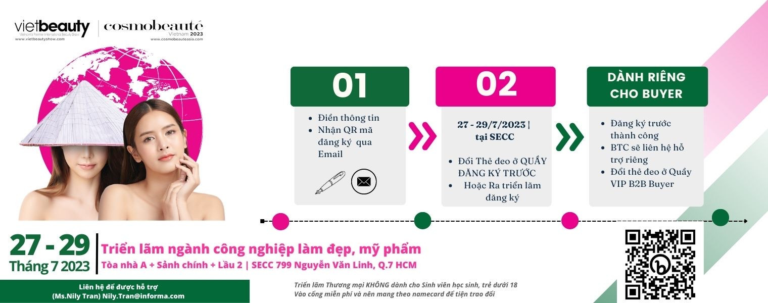 Triển lãm thương mại quốc tế Vietbeauty & Cosmobeauté Vietnam 2023 sẽ được tổ chức từ 27 - 29/07 tại SECC (TP.HCM), dự kiến quy tụ hơn 400 đơn vị cùng hơn 1000 thương hiệu làm đẹp đến từ hơn 25 quốc gia, vùng lãnh thổ. Với quy mô hơn 10.000m2, triển lãm đem tới cơ hội cho các doanh nghiệp quốc tế và Việt Nam tiếp cận các thương hiệu làm đẹp hàng đầu từ khắp nơi trên thế giới, kết nối với các nhà cung cấp tiềm năng, kiến tạo cơ hội kinh doanh mới và cập nhật các xu hướng làm đẹp, thẩm mỹ hiện đại nhất trong ngành.