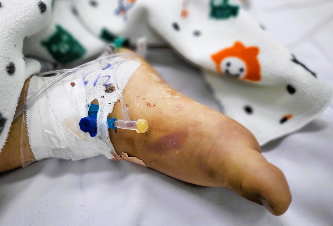 Bàn tay, cánh tay, cổ chân cậu bé đầy vết thâm tím và máu đông đọng lại, dấu vết của những lần lấy ven truyền dịch hoặc lấy máu xét nghiệm. Hình ảnh này đã quen thuộc đến ám ảnh với các y bác sĩ tại Khoa Hồi sức Nhiễm và Covid-19.