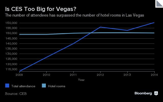 2015: CES 2015 đang diễn ra tại Las Vegas. Theo trang Bloomberg, CES đang gặp phải một vấn đề mà nhiều sự kiện khác đều mong muốn mắc phải: đó là trở nên quá to lớn. Bloomberg cho rằng, với khoảng 160.000 du khách đến CES, sức chứa của các khách sạn tại Las Vegas đã bị quá tải, không đủ chỗ cho tất cả khách đến thành phố này.