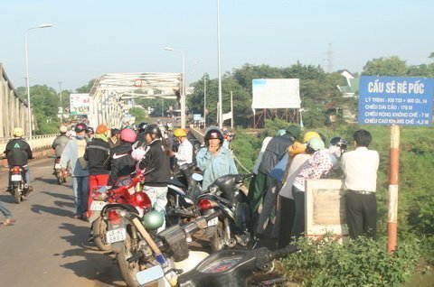 | Đông đảo người dân tụ tập tai vị trí xe rôi trên cầu Serepok |