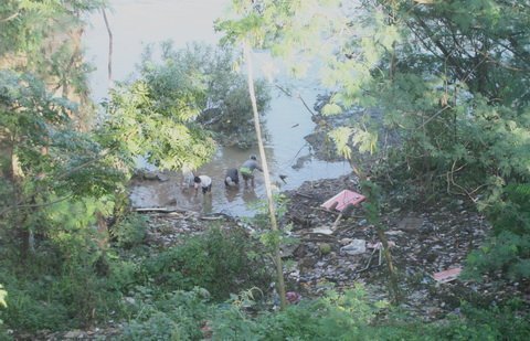 Tai vị trí xe rơi, có khoảng 4 người đang cắm cúi mò tìm trong dòng nước những