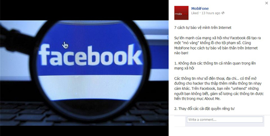 MobiFone vừa có chia sẻ về 7 cách tự bảo vệ mình khá hữu ích trên Facebook. Trong 7 cách này có những nguyên tắc khá đơn giản như không đưa các thông tin cá nhân quan trọng lên mạng xã hội, thay đổi cài đặt quyền riêng tư về “Bạn bè” (“Friends”), không sử dụng những mật khẩu quá dễ nhớ, sử dụng các mật khẩu khác nhau trên các tài khoản khác nhau, tắt các tùy chọn GPS hay cảnh giác với email lừa đảo.