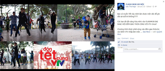 Trên Facebook, VTVPlus cùng hội Flash Mob Hà Nội kêu gọi thêm các bạn trẻ đến tham gia tập dượt cho buổi diễn tập thể sẽ được VTV phát sóng đêm Giao thừa Tết Giáp Ngọ.