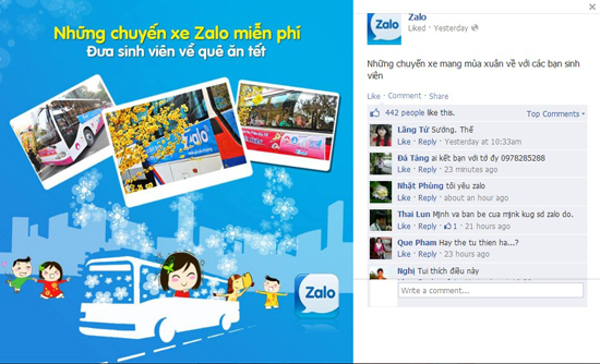 Zalo đăng những hình ảnh rất ý nghĩa về nghĩa cử hỗ trợ xe đưa sinh viên có hoàn cảnh khó khăn ở TP.HCM về quê ăn Tết. Cụ thể, Zalo đã hỗ trợ 10/55 chuyến xe với Trung tâm Hỗ trợ Học sinh Sinh viên TP.HCM, tổng giá trị lên đến 323 triệu đồng.