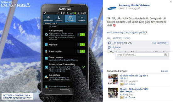 Gần Tết, đến cả thời tiết TP.HCM cũng lạnh. Tuy nhiên, Samsung có phương án để những người sử dụng Galaxy Note 3 vẫn có thể dùng được dù đang đeo găng tay. Cách đó là tăng độ nhạy của màn hình cảm ứng, thông qua vào mục Settings > Control > Increase touch sensitivity.