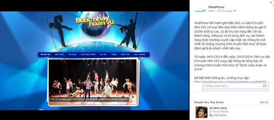 VinaPhone đang dùng Facebook để quảng cáo cho dịch vụ Giải trí truyền hình 555, kênh thông tin giải trí có tính thời sự cao và có độ thu hút rộng thông qua tin nhắn SMS. Cụ thể hơn, từ ngày 4/1 đến 30/3, dịch vụ 555 sẽ cung cấp thông tin tổng hợp về chương trình truyền hình thực tế “Bước nhảy hoàn vũ 2014”, phát sóng trên VTV3. Trong thời gian này, khi sử dụng dịch vụ, khách hàng sẽ có cơ hội trúng thưởng 50 triệu và điện thoại iPhone 5S mỗi tuần.