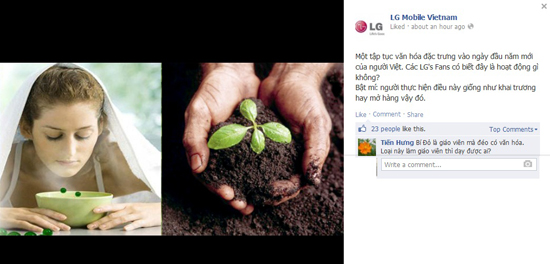 LG vừa thử thách các fan bằng trò “Đuổi hình bắt chữ” khá thú vị, đáp án là “xông đất”, một tập tục văn hóa truyền thống của người Việt Nam vào đầu năm mới. Thử thách này trông thế nhưng cũng chẳng hề dễ vì vẫn có người trả lời nhầm sang “Ăn quả nhớ kẻ trồng cây”.