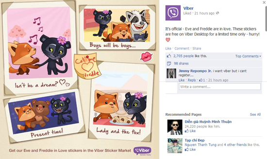 Ngày Valentine, Viber giới thiệu cho các fan bộ sticker Eve và Freddie đang yêu trông cực kỳ tình cảm. Không những vậy, bộ sticker này còn được miễn phí cho máy tính để bàn trong một thời gian nhất định.