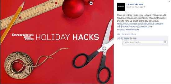 Lenovo đang giục giã các fan tham gia sân chơi Holiday Hacks trước khi hết thời hạn vào ngày 15/2. Đây là nơi bạn có thể chia sẻ những sáng tạo độc đáo, những mẹo hay để làm cho sản phẩm Lenovo trở nên thân thiết hơn, chẳng như như làm đồ trang trí, làm máy chiếu tự chế, làm cáp OTG tự chế…