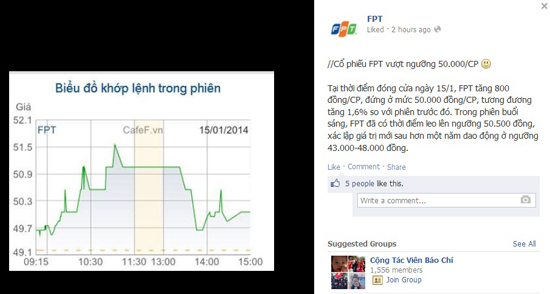 Tình hình trên sàn chứng khoán của FPT đang rất sáng. Tại thời điểm đóng cửa ngày 15/1, cổ phiếu FPT đã tăng 800 đồng một cổ phiếu, tương đương mức 50.000 đồng một cổ phiếu, tăng 1,6% so với phiên trước đó. Trong phiên buổi sáng, FPT có thời điểm leo lên ngưỡng 50.500 đồng, xác lập giá trị mới sau hơn 1 năm dao động ở ngưỡng 43.000 - 48.000 đồng.
