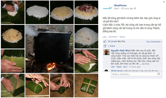 Ấn tượng nhất trong ngày hôm nay có lẽ vẫn là hình ảnh gói bánh chưng những ngày giáp Tết trên Facebook của VinaPhone. Đó là hình ảnh nhóm fanpage VinaPhone gói bánh cùng các bé trong cô nhi viện ở Long Thành, Đồng Nai 2 năm trước. VinaPhone khuyến khích các fan chia sẻ kỷ niệm xung quanh nồi bánh truyền thống này. Có những kỷ niệm gói bánh với mẹ, với bà và có cả những chia sẻ của nhân viên trực tổng đài VinaPhone không về ăn Tết dưới phần bình luận.