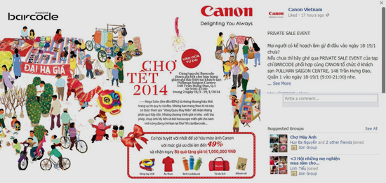 Trong 2 ngày cuối tuần sắp tới (18-19/1), tạp chí Barcode cùng với Canon sẽ tổ chức sự kiện Hội chợ Pullman Saigon Centre (Quận 1, TP.HCM). Những khách hàng đến tham dự sẽ được tặng quà trị giá 1 triệu, đồng thời giảm giá đến 80% các mặt hàng thời trang.