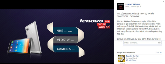 Vào chiều mai (17/1), Lenovo sẽ giới thiệu một smartphone “siêu phẩm” mới trong một buổi lễ dự kiến rất hoành tráng tại khách sạn 5 sao Equatorial Hồ Chí Minh. Nhân dịp này Lenovo cũng tổ chức đố vui có thưởng để tặng 10 vé tham dự các 10 fan.