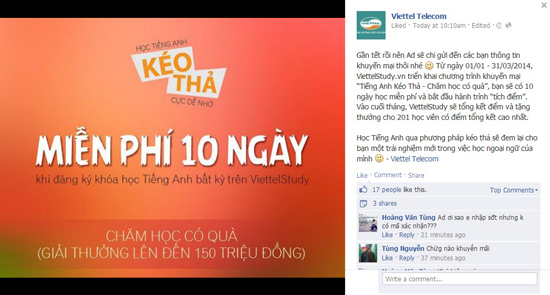 Tin vui dịp Tết từ Viettel là trang web học tiếng Anh ViettelStudy đang có chương trình khuyến mãi 10 ngày học miễn phí cho các học viên đăng ký từ nay đến 31/3. Ngoài ra, vào cuối tháng ViettelStudy cũng sẽ tổng kết và tặng thưởng cho 201 học viên có tổng điểm cao nhất.