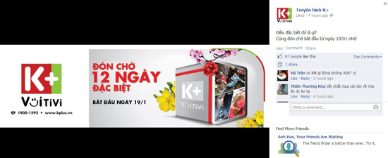 K+ đang úp mở về 12 ngày đặc biệt bắt đầu từ 19/1, kết thúc đúng ngày cuối năm. “Có khuyến mãi gì đúng không ad?” - bạn Hà Trần hỏi luôn. Hoặc cũng có thể đây là chuỗi chương trình truyền hình đặc biệt nào đó trên K+? Chỉ biết chắc chắn rằng đây là chương trình của K+ để đón Tết.